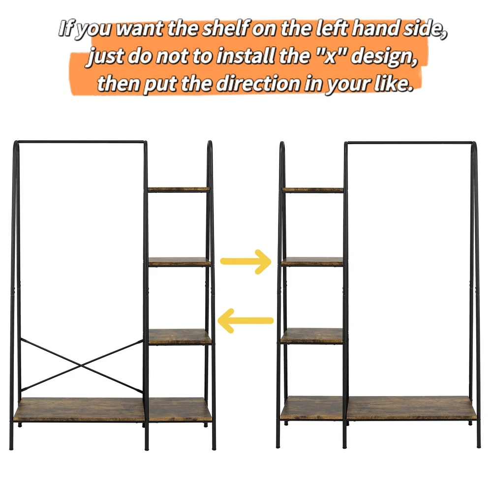 Finnhomy Rustic Clothes Rack, Clothing Rack for Hanging Clothes Heavy Duty Garment Rack with 5 Wood Shelves Freestanding Portable Closet Organizer for Bedroom/ Entryway / Boutiques,Matte Black TO BUY IS TO EARN: This heavy duty clothes rack with 5 rustic wood shelves will meet all your clothing/ daily storage demand. It can be a garment coat rack / shoe rack/ decor display rack/ book shelf/ plant stand/ clothes drying rack etc for your bedroom/ nursery room/ living room/ entryway/ hallway/ boutiques. A-Shaped Patent Design : The NEW A-shaped heavy metal Leg structure can not only achieve 100% STABILITY, the soft & simple ARC LINES DESIGN which also make more fashionable. You can use it in small space, and this design will keep your clothes AWAY FROM the wall. Perfectly combining practicality and aesthetics, decorating your home. EXTEND WIDTH AND HEIGHT: We extend the overall height and hanging rod, so the rack can hold more clothes, coats, jackets, longer dresses, robes,boots,handbag etc. Provide you with a more practical and efficient portable coat rack. PREMIUM QUALITY: This freestanding clothes hanging rack made of φ19mm heavy metal stand and 15mm MDF shelves, can hold 350lbs with ease. Professional production lines with BSCI and SGS certification and STRICT QC ensure that every detail is impeccable. EASY TO ASSEMBLE: All the parts and hardware have code stickers, you just need to correspond the code number with instruction manual, it will be assembled easily.