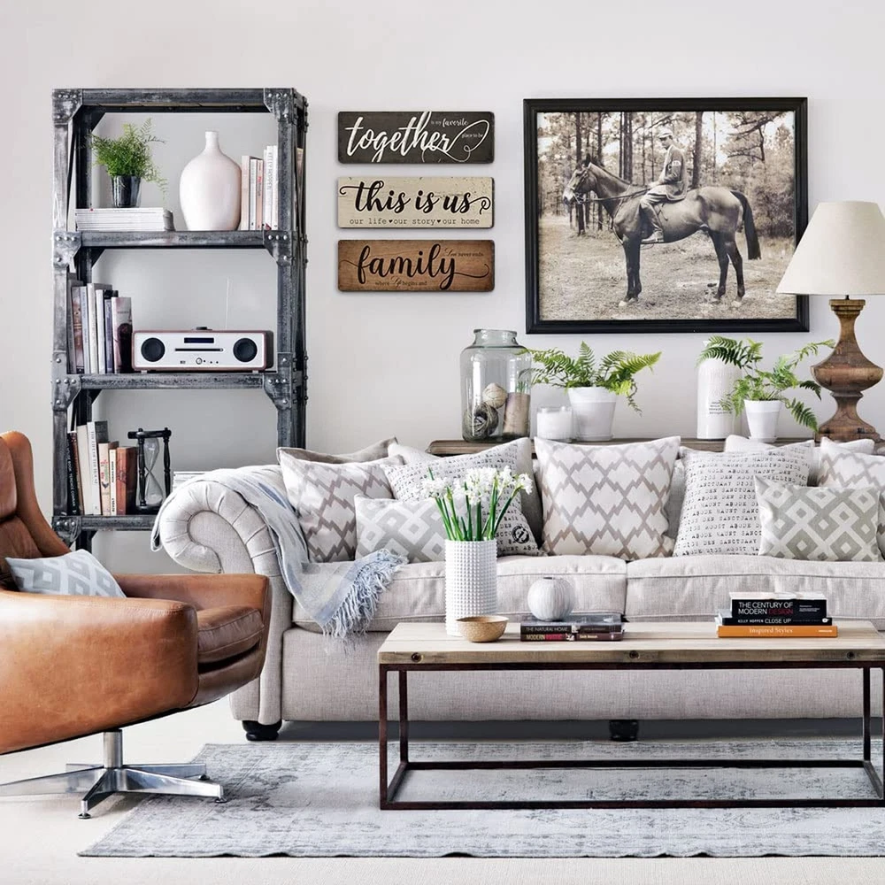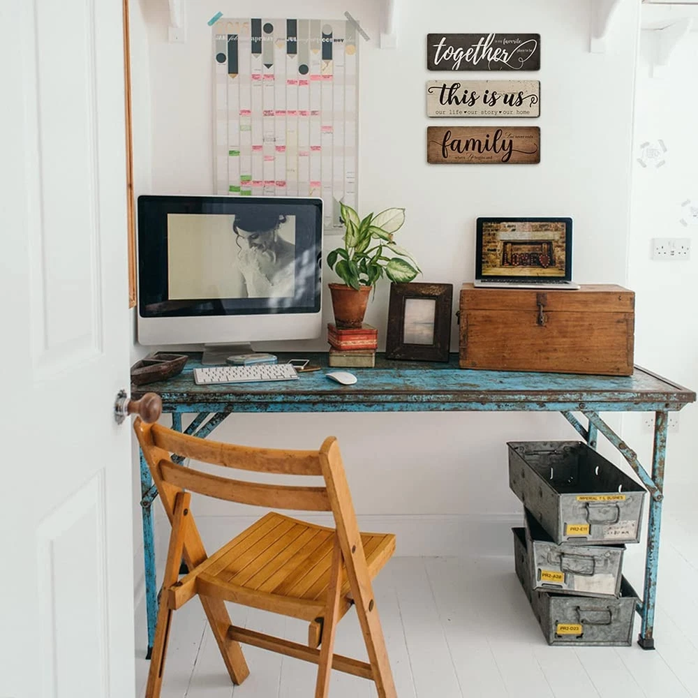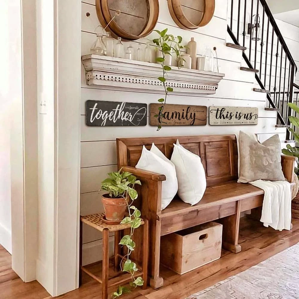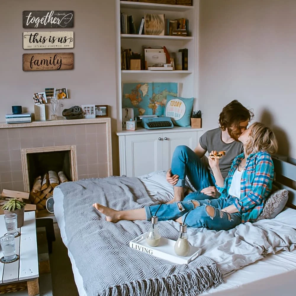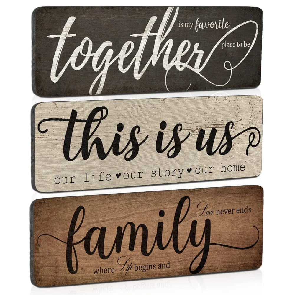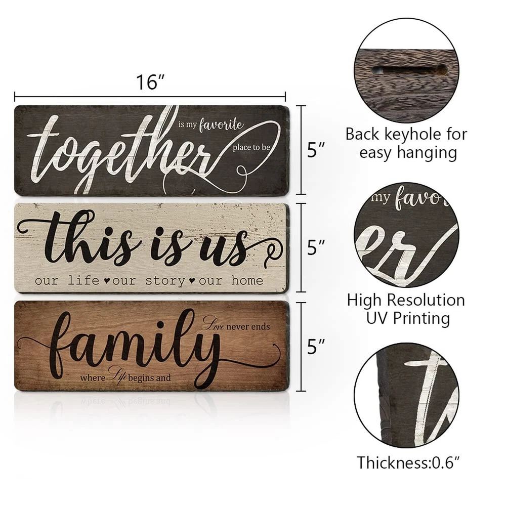 Rustic Home Decor 3 Pieces Together This Is Us Family Home Wall Decor Wooden Signs For Bedroom Living Room Kitchen Decor Product Details Product Dimensions: 16 x 5 x 0.7 inches Item Weight: 10.6 ounces Manufacturer: TIANCENTRAL H DIFFERENT SAYINGS ON 3 SIGNS : The living room wall decor signs are printed on the different sayings - [together is my favorite place to be]; [this is us, our life, our story, our home] and [family, where life begins and love never ends]; the warm sayings will create a good atmosphere to your living environment. LONG-LASTING TO USE : The farmhouse home decor signs are made of quality solid wood and printed with high precision UV ink which is not easy to fade or break. You can use them to decor your home for a long time. EXTENSIVE USAGE : The rustic home decor wooden sign is an ideal decoration which is suitable for many places, such as living room, bedroom, kitchen, classroom, entryway, office, farmhouse and more to create a family atmosphere, bring you a warm feeling. EASY TO HANG : These family wall decor signs come ready to hang with a keyhole on the back. You can mount it on wall easily which is very convenient and saves your time. IDEAL GIFT : Farmhouse living room decor signs are an ideal gift that you can give it to your friends, classmates, family, colleagues and more, and it also can be a nice gift for anniversaries, weddings, Christmas party and New Year party.
