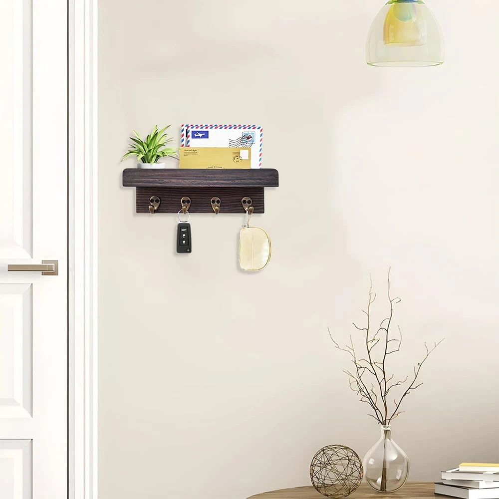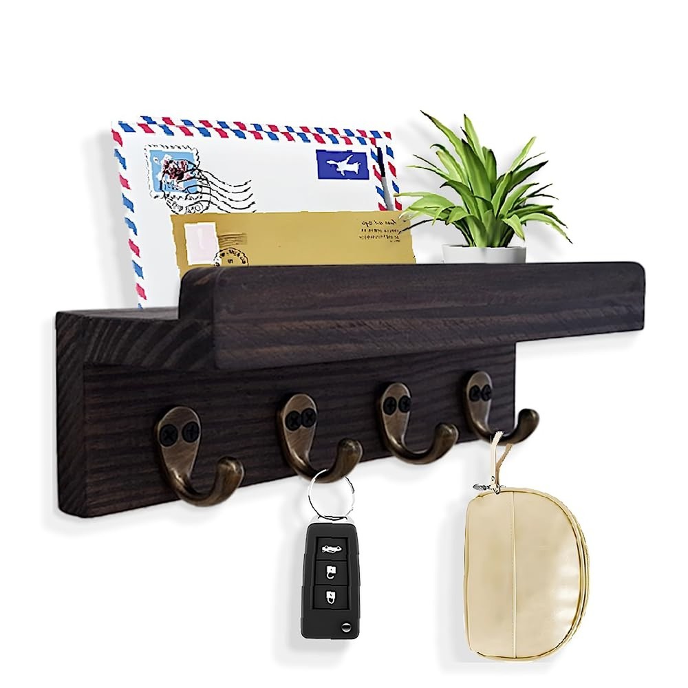 Rustic Key Holder, Farmhouse Shelf with 4 Hooks, Wall Mounted Key Racks, Wooden Mail Organizer with Hooks for Entryway (Black-Pine) Product Details Color: Black-Pine Brand: Purearth MPN: KH-Omega-W3 EAN: 3870003666087 UPC: Does not apply Color: Black-Pine Brand: Purearth Material: Pine Finish Type: Polished Mounting Type: Wall Mount Color: Black-Pine Brand: Purearth Material: Pine Finish Type: Polished Mounting Type: Wall Mount Style: Rustic Weight Limit: 8 Pounds Special Feature: Handmade Recommended Uses For Product: Garage, Holder, Key Hanger, Key Holder, Kitchen, Laundry, Rack, Shelf, Wall Shape: Rectangular Item Weight: 0.3 Pounds Included Components: Accessories Item dimensions L x W x H: 9.8 x 3 x 3.9 inches Number of Hooks: 4 Minimum Weight Capacity: 8 Pounds Surface Recommendation: Indoor Maximum Weight Recommendation: 10 Pounds Manufacturer: A10 Design Private Limited Item Weight: 4.8 ounces Product Dimensions: 9.8 x 3 x 3.9 inches Item model number: KH-Omega-W3 Finish: Polished Item Package Quantity: 1 Maximum Weight Capacity: 8 Pounds Special Features: Handmade Batteries Included?: No Batteries Required?: No Date First Available: July 12, 2022 Sturdy and Practical: Purearth farmhouse key hooks is made of solid wood with fine workmanship, helping you to organize small items and blends well with any home decor style. Multifuctional Floating Shelf: L-shape shelf prevents things from falling, and holding your mail, bills. Photo frames or potted plants can also be placed on this key rack. Versatility Hooks: The vintage key holder for wall decorative has 4 hooks, perfect for hanging keys, sunglasses, umbrellas, dog ropes, etc. Organize Your Space: Key hooks for wall can be put in any place that needs to be stored, such as entryway, bedroom, kitchen, bathroom, garage or laundry room, it can also decorate your home. Easy to Install: Comes with installation guide, screws and anchors are easy to assemble, and heavy load capacity of this key hanger has 6lbs. Dimension: 24.5 cm x 7.5 cm x 6.5 cm Rustic Key Hooks for Wall The wall mounted key holder is used for organizing and storing all the important keys in one place within your eyesight. Using a key holder is a great habit to have, just hang the key on the key hooks at the moment you enter the home, and you will never forget to lose the key again! SPECIFICATION Size (L x W x H): 24.5 cm x 7.5 cm x 6.5 cm Material: 100% Natural Wood Color: Brown Weight: 0.8 lbs/ 400g