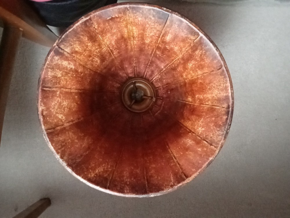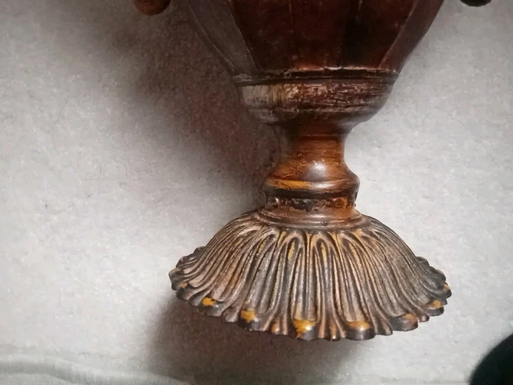 This urn planter is a large faux antique distressed metal vase with a rustic multicolor finish. It measures 12 inches in height, 10 inches in width at the rim, and weighs a solid 4 pounds. This free-standing indoor planter has a vintage style and can be used in any room as a decorative vase or planter.