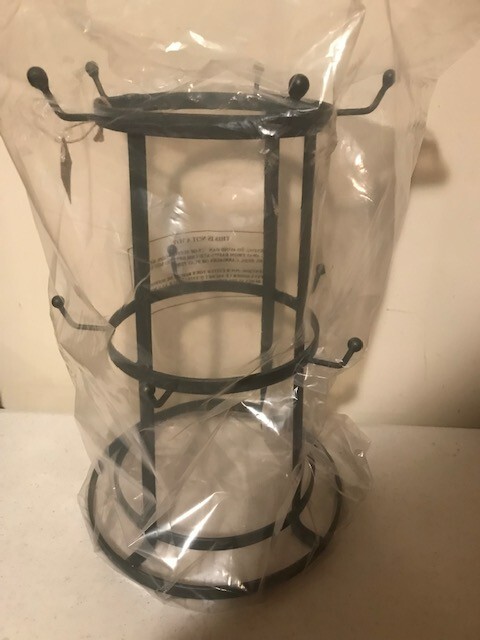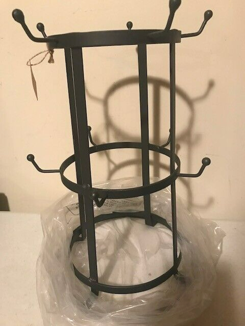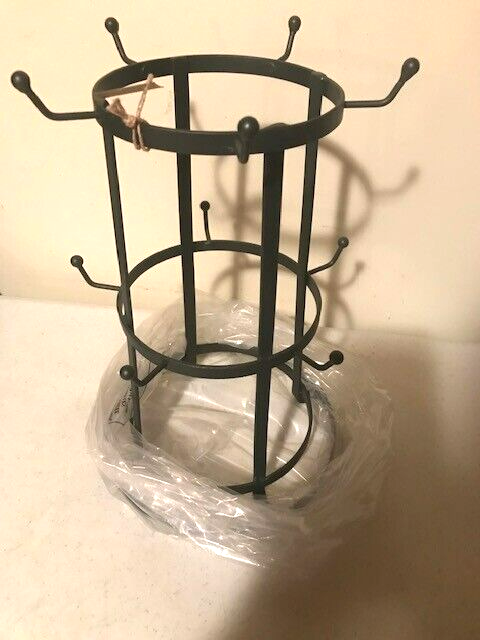 Here is a new tabletop mug rack, this is made o metal nad a dark smokey Black finish,It has 10 hooks on it to hang standard size mugs, holds 10 mugs on it, nice rustic mug storage rack and measures 9″ x 13″ MUGS and other items in picture NOT INCLUDED, IS FOR RACK ONLY