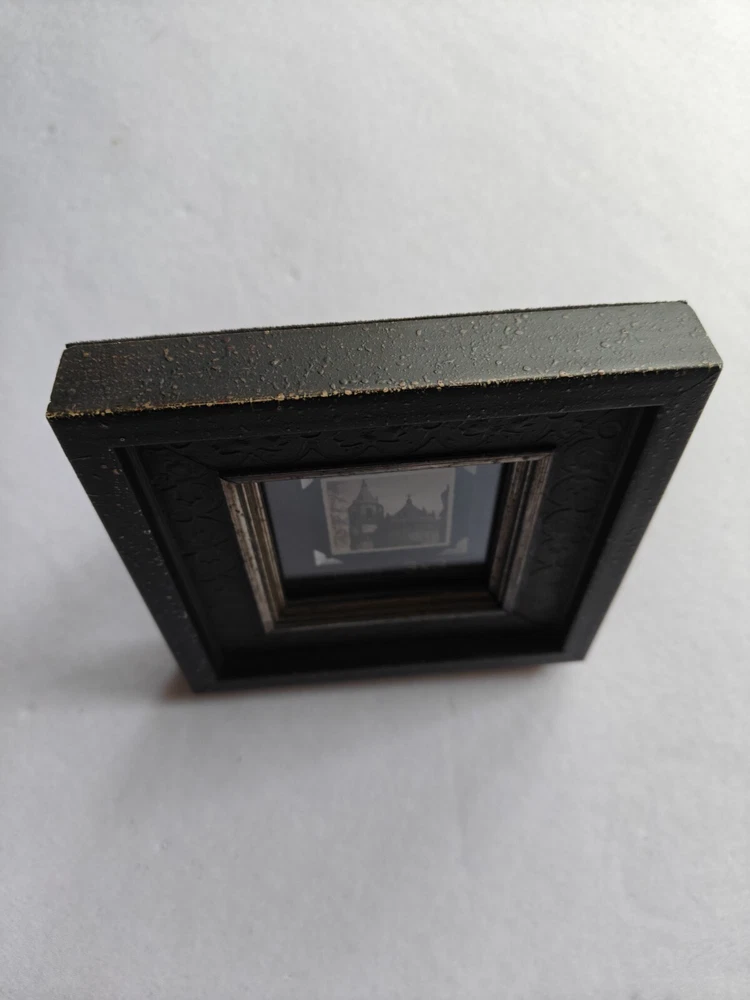 This rustic Hobby Lobby picture frame features a brown wooden material with a textured finish, adding a touch of charm to any home décor. frame is designed to hold a 3x3 inch photo. The rustic design of this frame makes it a perfect addition to any room in need of a cozy and inviting touch. outer measurements of frame are 5 1/2 by 5 and 1/2 by 1 in