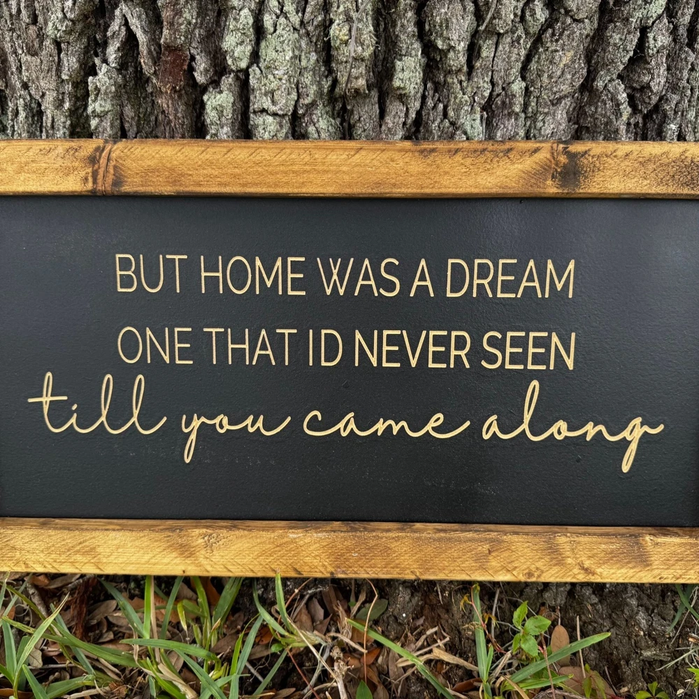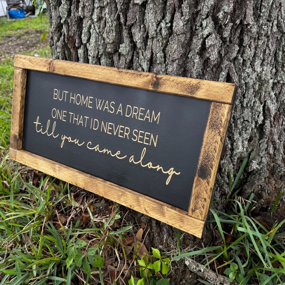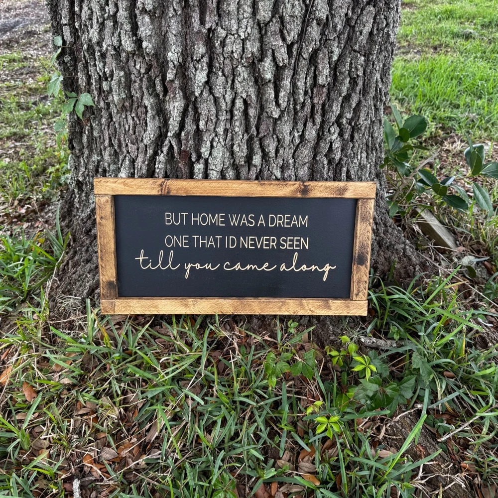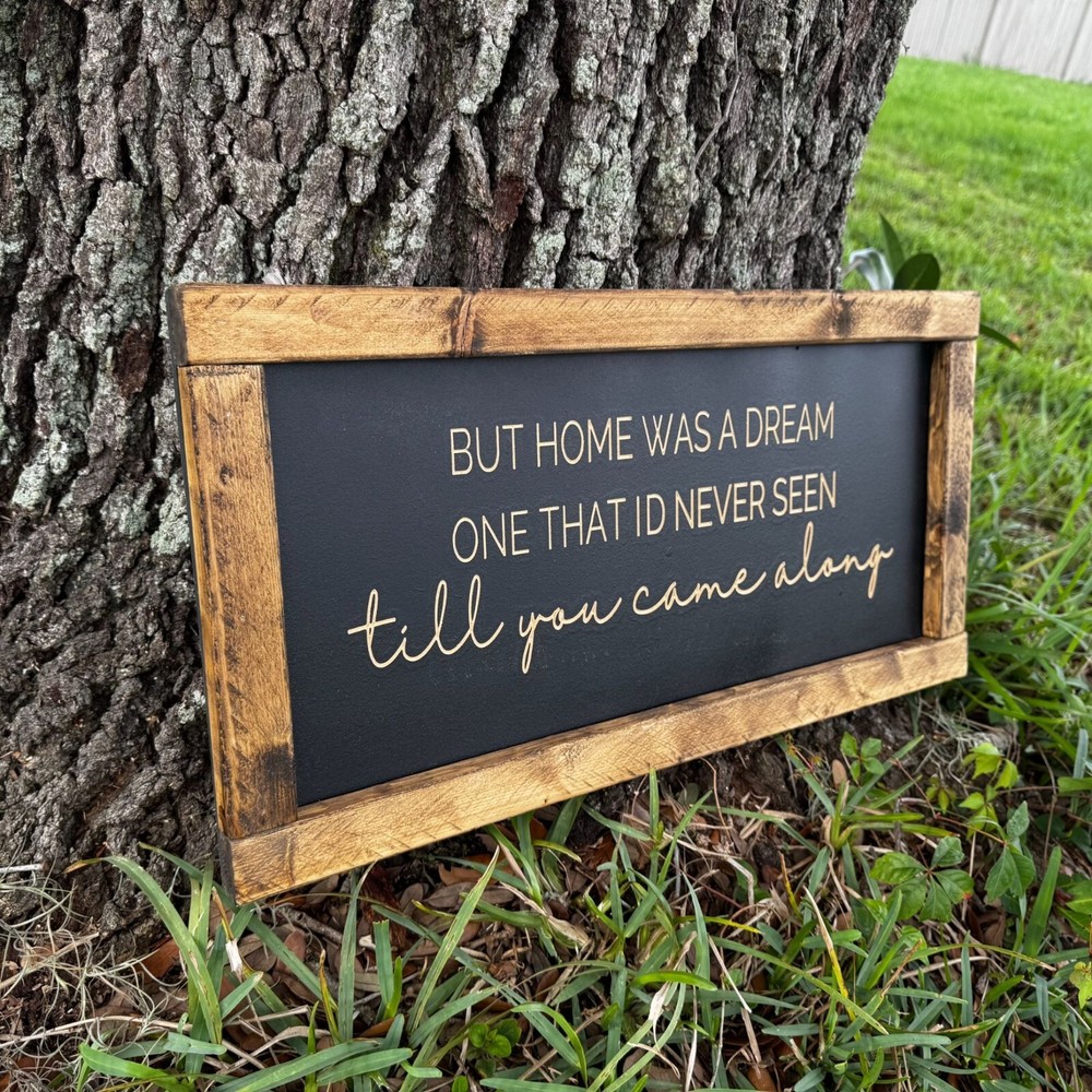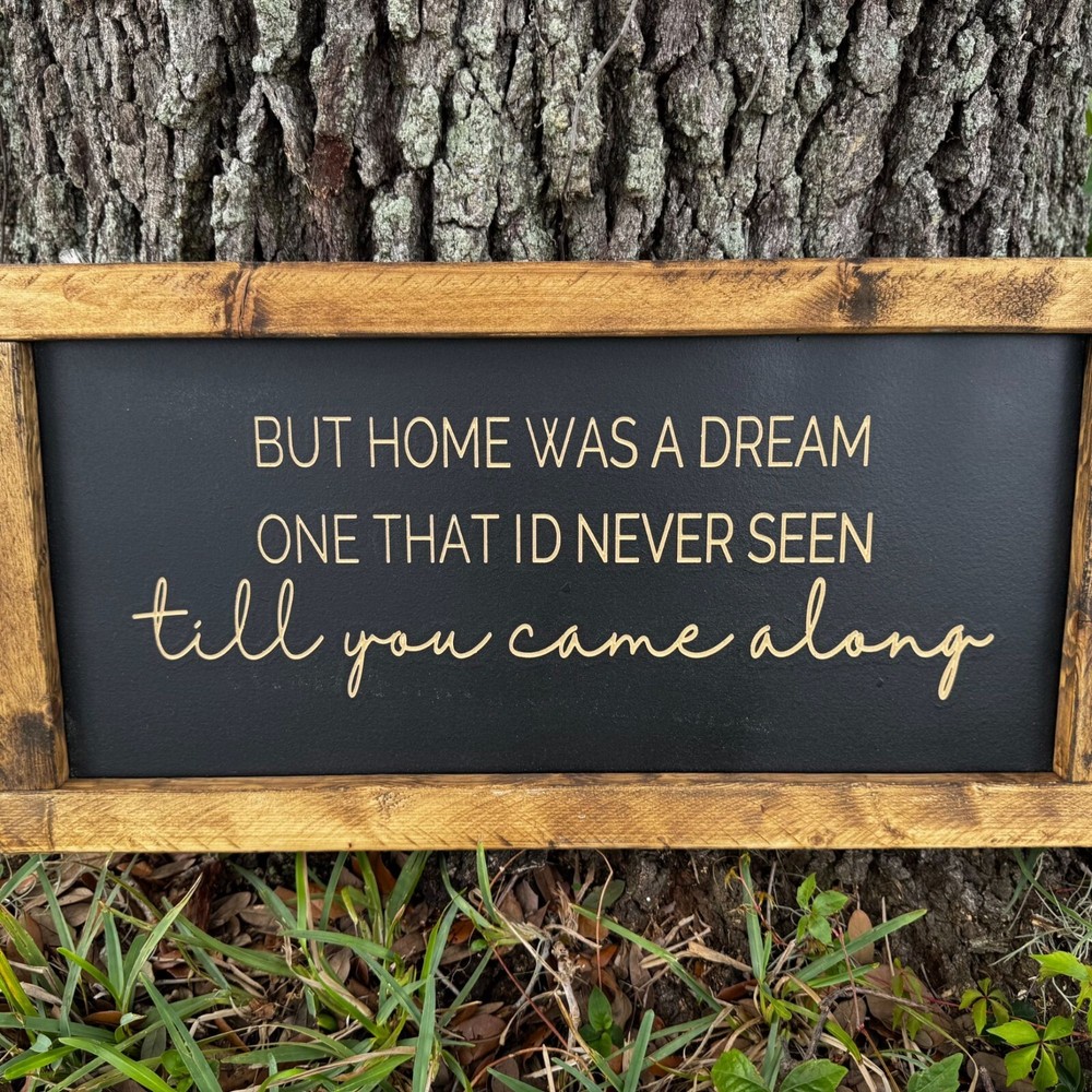 This listing is for "But home was a dream one that I'd never seen till you came alone”, wood farmhouse sign. The frame is made of 1x2 pieces of wood and is stained. The sign consists of thick, black MDF that is painted with chalk paint prior to being carved on a CNC machine. All signs are engraved/carved. No stickers or painted letters! Farmhouse signs are 12 inches tall and 24 in wide. Details: **Signs come with (2) hooks on the back side for easy hanging. **Weight of the farmhouse sign is approximately 3.5 lbs. **All items are sealed with multiple top coats to prevent any wear.