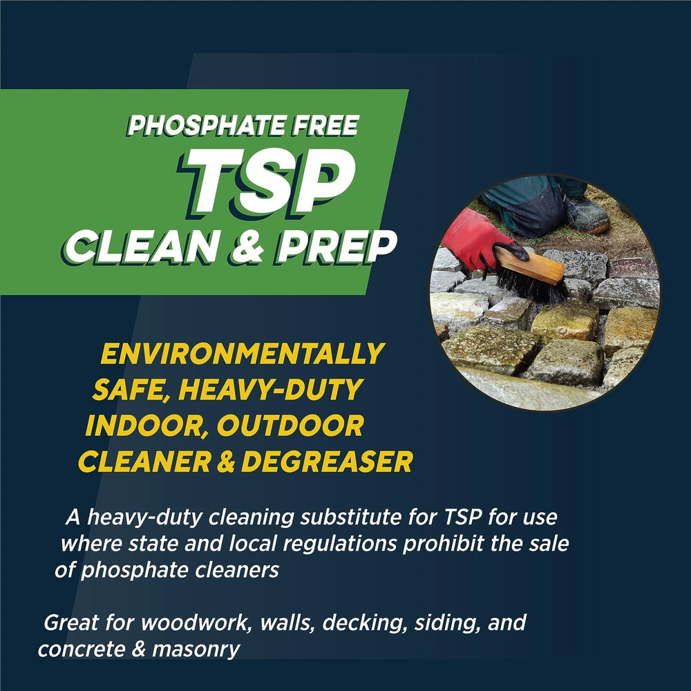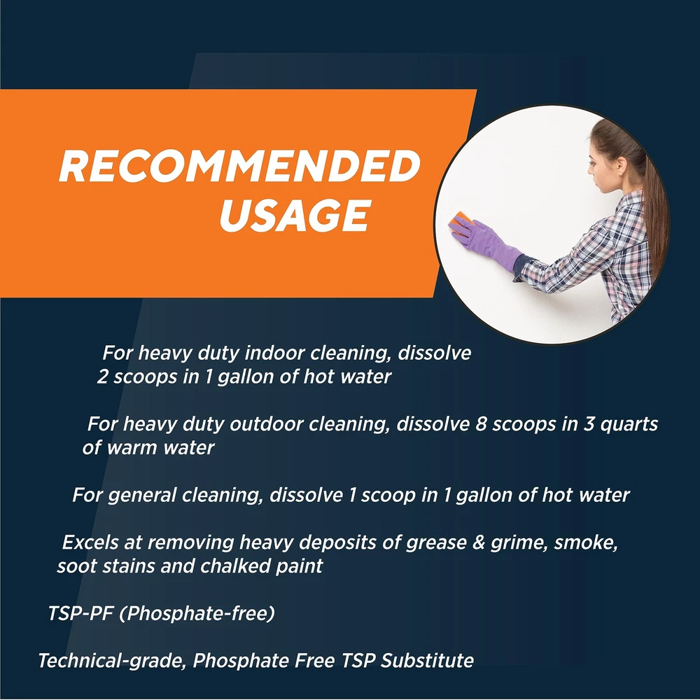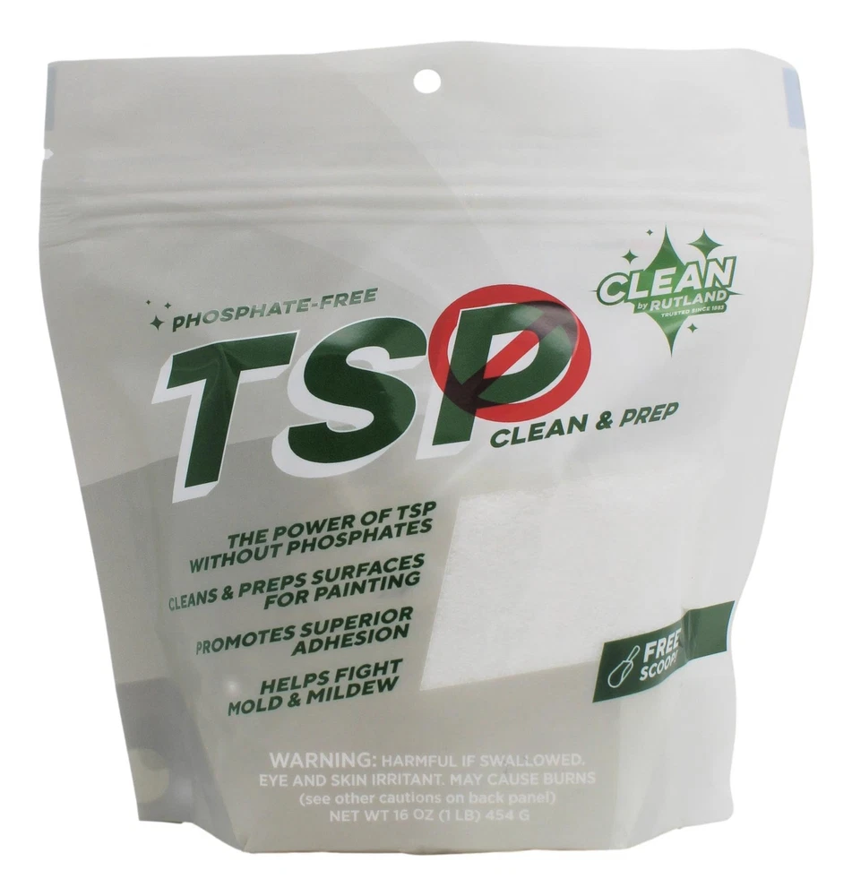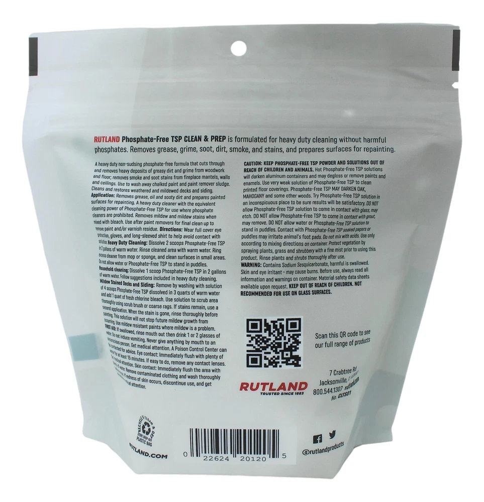 RUTLAND TSP-PF is a technical-TSP substitute intended to be combined with water to create a powerful cleaning solution for both indoors and outdoors. Formulated to act as both a degreaser and a heavy duty-cleaner, it will remove grease, grime, soot, dirt, smoke, and stains. Works great on woodwork, walls, decking, siding, concrete, and masonry. Safe, heavy-duty indoor, outdoor cleaner & degreaser A heavy-duty cleaning substitute for TSP for use where state and local regulations prohibit the sale of TSP. Great for woodwork, walls, decking, siding, and concrete & masonry Excels at removing heavy deposits of grease & grime, smoke, soot stains and chalked paint For heavy duty indoor cleaning, dissolve 2 scoops in 1 gallon of hot water