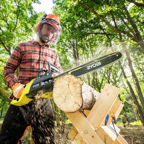 Ryobi 36V 18” 45cm HP Brushless Chainsaw 6.0Ah Kit Features Kit includes: 36V HP Brushless 18” (45cm) Chainsaw, 36V 6.0Ah battery, 36V 6A Fast Charger and Hard Case 18” (457mm) bar length, 22.5m/s Chain speed Powerful HP brushless motor Automatic/adjustable oiling system for chain lubrication Inertia-activated chain brake for user protection The 36V HP Brushless 18” (45cm) Chainsaw delivers a powerful performance for heavy-duty domestic gardening applications such as felling trees and cutting logs for removal or firewood. This kit also comprises a 36V 6.0Ah battery, 36V 6A Fast Charger and Hard Case. The 18” Chainsaw’s brushless motor generates high chain speeds up to 22.5m/s, high torque and long runtimes. The large, 18” (457mm) length bar can cut through logs up to a maximum 400mm diameter. So, it’s also a great tool for cutting large, fallen trees you might encounter while 4WDing or camping. With a fully-charged 36V 5.0Ah lithium battery, this Unit can perform up to 85 cuts at 170mm. It’s an ideal petrol equivalent Chainsaw without the hassle of pull cords, chokes, exhaust fumes or petrol top-ups. The inertia-activated chain brake is designed to protect users from kickback scenarios. Easy maintenance features include the onboard chain tensioning. The automatic oiling system keeps the bar lubricated and operating. The included hard case is purpose-built to protect the chainsaw during storage and transport. This 36V 6.0Ah High-Performance Battery (included) powers most RYOBI 36V garden tools (excluding models RLM36X50HP, RCS36B35 and RPW3600). Its LED display communicates charge, temperature and overload status. The included 36V 6A Fast Charger can recharge any RYOBI 36V battery. It’s fast enough to fully charge a 36V 6.0Ah battery in as little as 70 minutes. It also has a detailed LED light display for accurate battery readings. The 18” Chainsaw is part of RYOBI‘s ONE+ HP™ series of tools that utilise advanced technologies, like brushless motors that deliver higher performance, extended battery runtimes and longer motor life. These tools are ideal for tough conditions and larger gardens with mature plants. They also have superior ergonomics for a premium user experience. Dimensions Width Height Length Product 883mm 220mm 270mm Package 250mm 500mm 300mm Weight Easy To Carry Total Weight 4.5kg Specifications Model Name Ryobi 36V HP™ Brushless 18” (45cm) Chainsaw 6.0Ah Kit Model Number R36XCHS26 Corded (Yes/No) No Chain size (mm) 457 Charger Included (Yes/No) Yes Cordless (Yes/No) Yes Battery Voltage (volts) 36 Batteries Included (Yes/No) Yes Chain Specification 18” (457mm), 62 Drive Links, 3/8LP, 0.050” Gauge Listing and template services provided by inkFrog