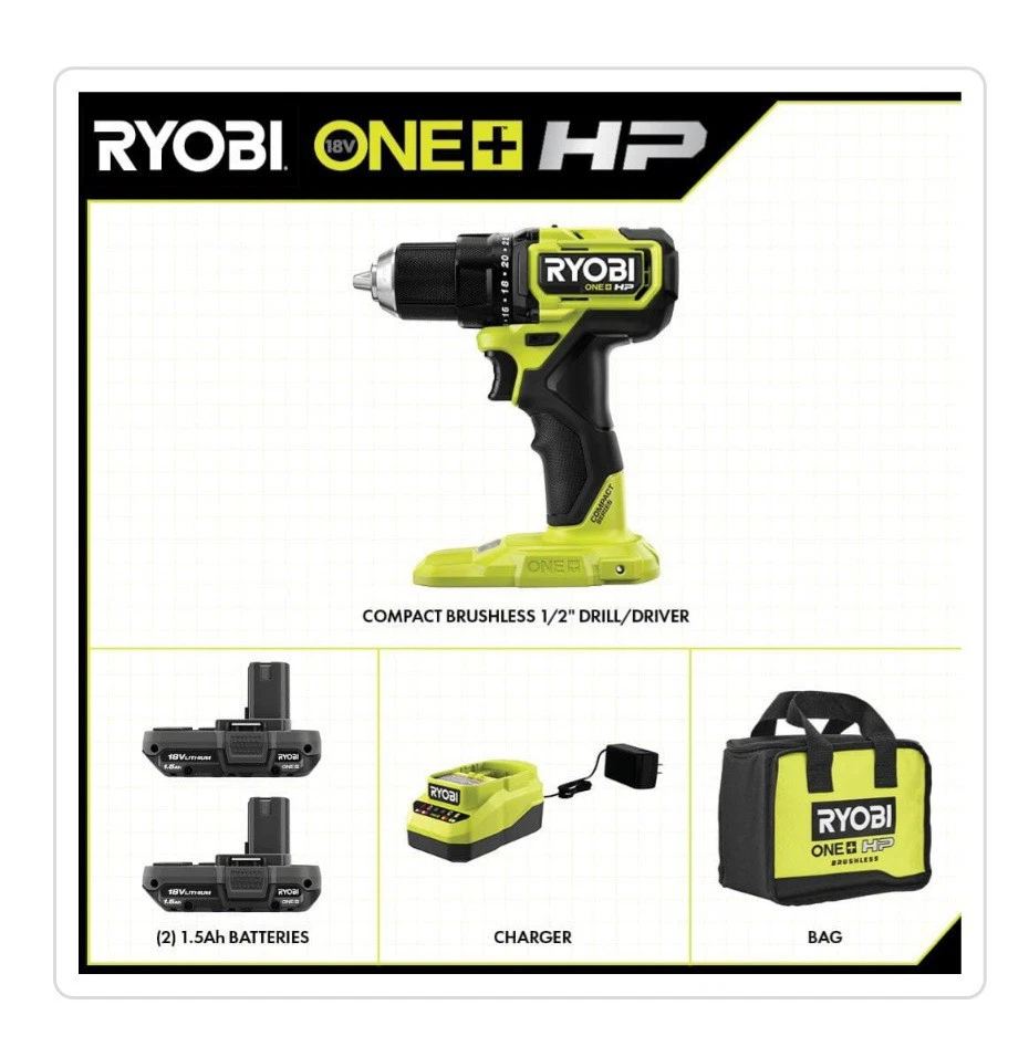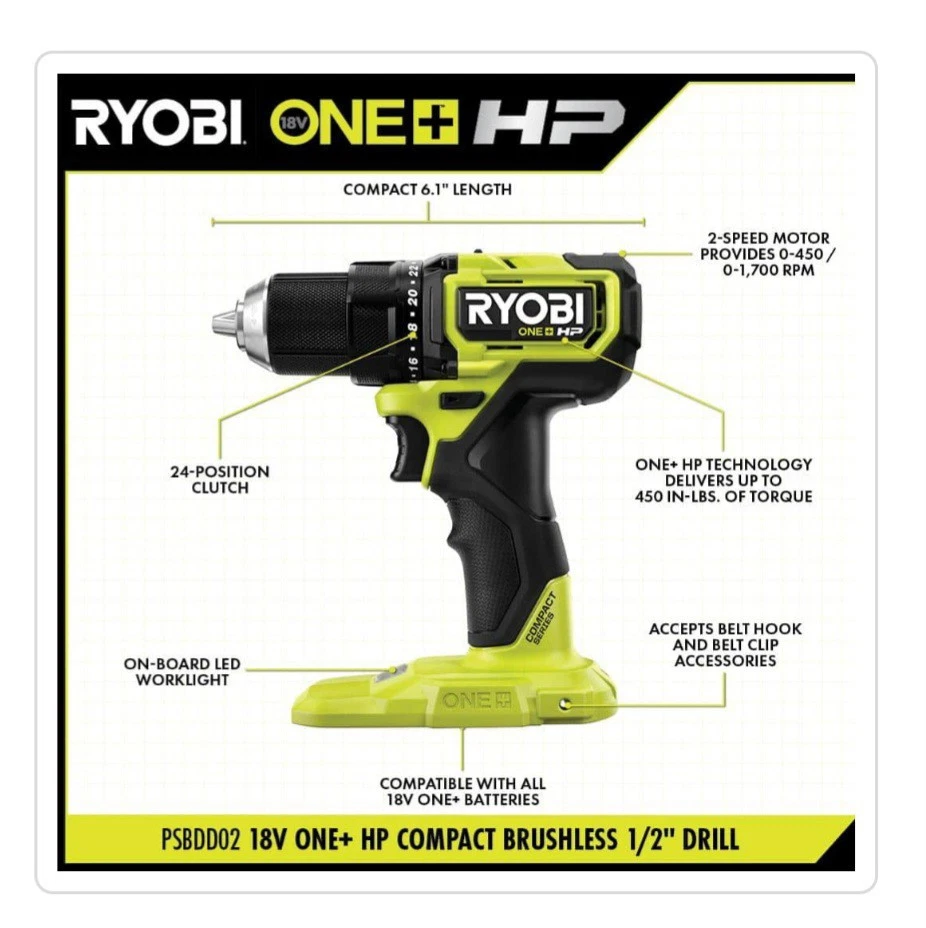 Ryobi One+ HP 18V Brushless Cordless Compact 1/2" Drill/Driver Kit PSBDD02K2. Condition is New. Shipped with USPS Priority Mail.