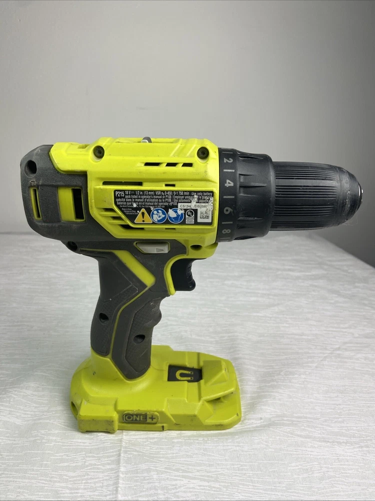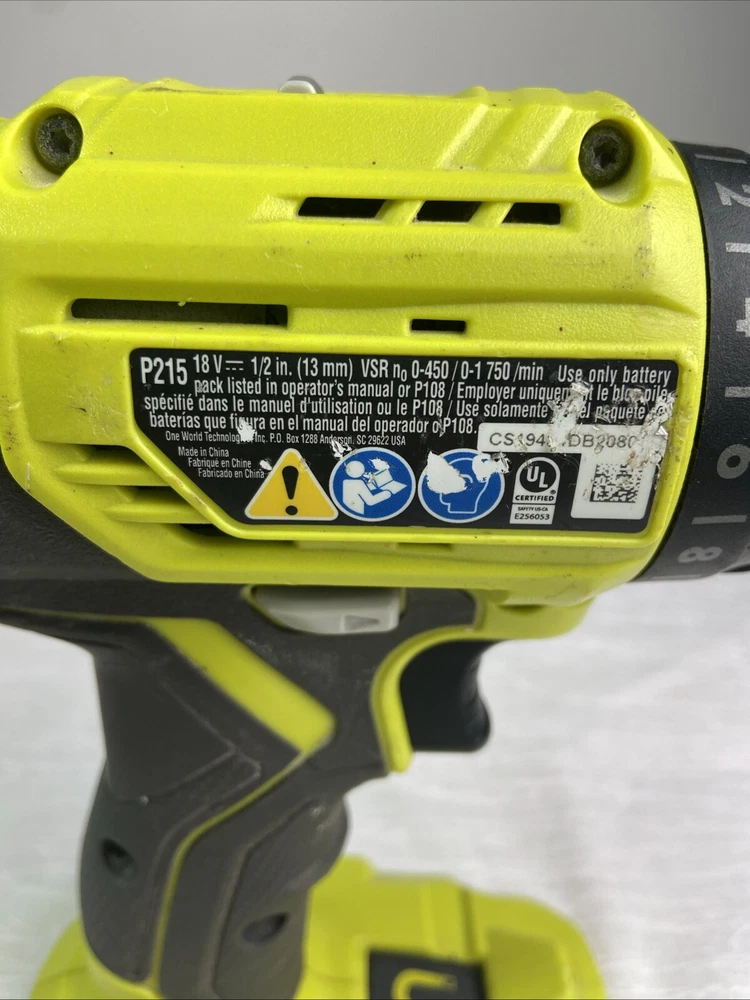 Ryobi P215 18-Volt Lithium-Ion Cordless 1/2 in Drill (BARE TOOL ONLY). No battery. Tested, works. Has some scuffs and scratches from normal use. See pictures for more details