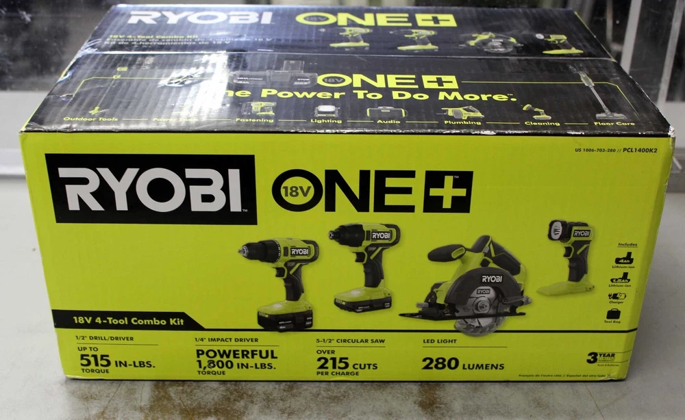 Ryobi PCL1400K2 ONE+ 18V Cordless 4-Tool Combo Kit w/ 2 Batteries & Charger Brand New, Sealed. RYOBI introduces the 18V ONE+ 4-Tool Combo Kit with 1/2" Drill/Driver, 1/4" Impact Driver, 5-1/2" Circular Saw, LED Light, (1) 1.5Ah Lithium-ion Battery, (1) 4Ah Lithium-ion Battery, 18V Charger, and Bag. The ONE+ Drill/Driver provides up to 515 in-lbs. of torque and features a 1/2" ratcheting metal chuck to match your drilling and driving needs. The ONE+ Impact Driver is able to drive long deck screws or large lag screws with ease by delivering 3,400 IPM along with 1800 in-lbs. of torque controlled by a variable-speed trigger that churns out 2,700 RPM. The ONE+ 5-1/2" Circular Saw has the ability to cut through 2-by material, with over 215 cuts per charge. The ONE+ LED Light also has 280 Lumens of light output and has a 130° pivoting head for adjustable light beam direction. The ONE+ 4Ah and 1.5Ah Lithium-ion Batteries feature an integrated high visibility fuel gauge to monitor remaining runtime. The 18V Charger is compatible with RYOBI ONE+ Lithium-ion Batteries. Backed by the RYOBI 3-Year Manufacturer's Warranty, the 18V ONE+ 4-Tool Combo Kit includes (1) PCL206 18V 1/2" Drill/Driver, (1) PCL235 18V 1/4" Impact Driver, (1) PCL500 5-1/2" Circular Saw, (1) PCL660 LED Light, 18T Carbide Blade, Hex Wrench, (1) 18V 4Ah Lithium-ion Battery, (1) 18V 1.5Ah Lithium-ion Battery, Charger, Tool Bag and Operator's Manuals.