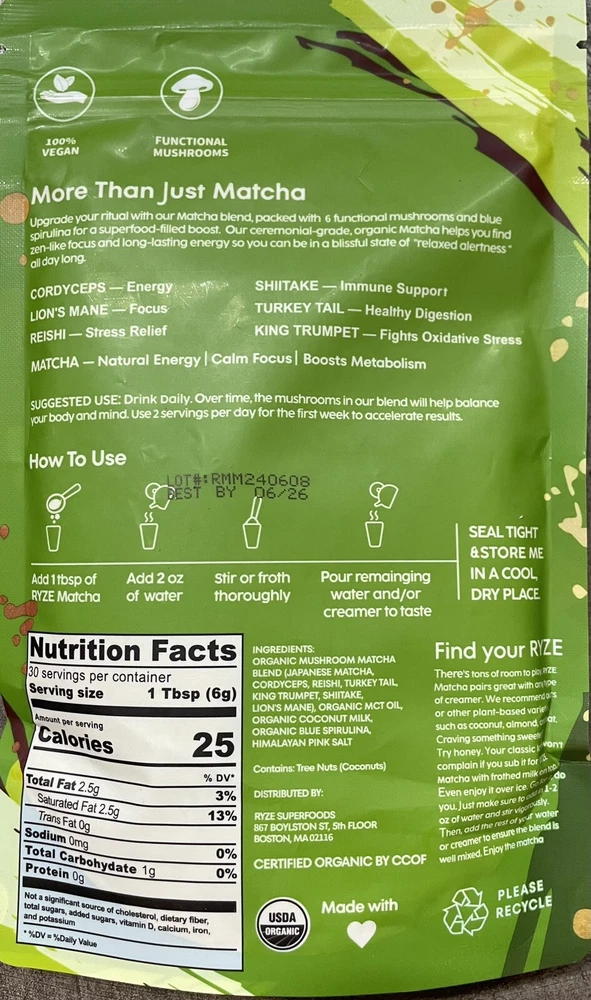 Calories per Serving:Less Than 50Brand:RyzeType:MatchaExpiration Date:07/2026Serving Size:1 TbspFood Specifications:Caffeine Free, No Artificial Coloring, No Artificial Flavoring, Organic, Sugar FreeProduct:Matcha TeaFood Aisle:PantryFlavor:MatchaNumber of Servings:30