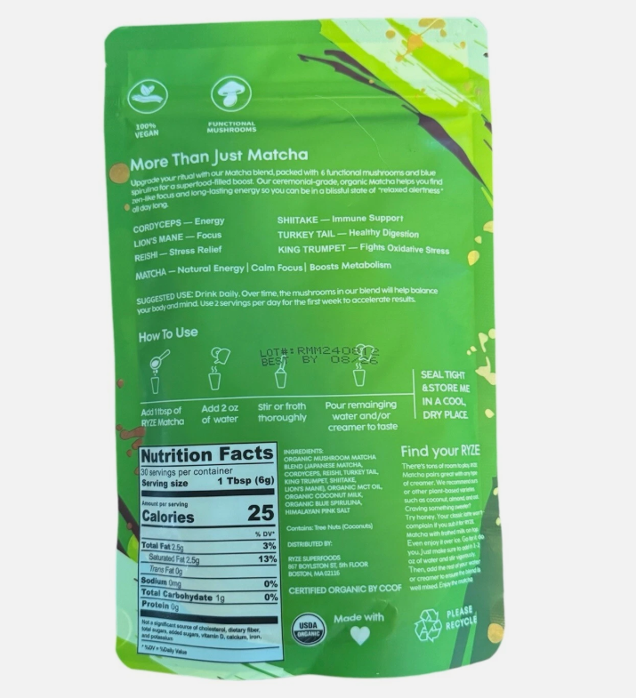 Ryze Organic Mushroom Matcha Coffee- 30 Servings, Free Spoon US Shipping This product falls under the Food & Beverages category and is specifically labeled as a non-alcoholic drink. The brand, RYZE, specializes in mushroom coffee, making it a unique addition to any pantry for coffee lovers looking for an organic option. One pack of the organic mushroom Green Tea coffee. providing a convenient and sustainable way to enjoy this delicious beverage at home. Fast Shipping