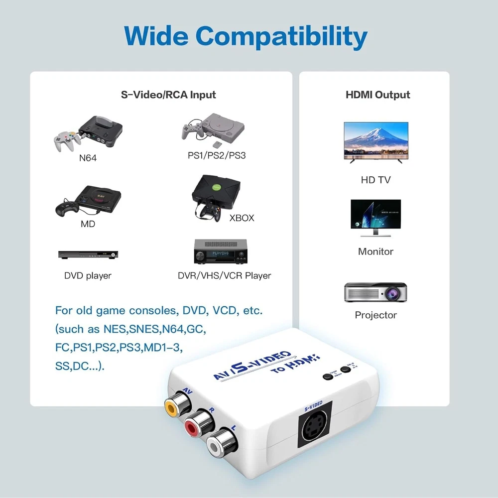 ✅ Brand New & High Quality ✅ Fast Shipping from Trusted Supplier ✅ 100% Customer Satisfaction Guarantee White 【S Video to HDMI Converter】Video processing by the S video signal source output, HDMI resolution 720P/480P or screen 16:9/4:3 ratio, display in HDTV/monitor,clear picture is so simple 【RCA to HDMI Converter】Converts analog RCA composite (Yellow,White, Red)Output HDMI resolution 720P/480P or Screen 16:9/4:3 ratio to display on HDTV/Monitor. Transfer the picture from your old device to HDTV and evoke your childhood memories 【Plug and Play】Plug and play, easy to operate, no need to install driver, low latency, clear and stable picture, no lag in playing games 【Wide Compatibility】Supports many old game machines, (such as NES,SNES, N64, GC,FC,PS1,PS2,PS3,MD1-3,SS,DC…), XBOX,VHS,DVD, VCD, etc 【Attention & Package】Please ensure to connect this AV/Svdieo to hdmi converter to power source to make it work. Package include: AV/S-Video to HDMI Converter*1, usb power cable(adapter not included)*1, Quick start guide*1 Black S Video to HDMI Converter: Video processing by the S Video signal source output, HDMI 720P/480P resolution or 16:9/4:3 screen ratio, display on HDTV/monitor, clear image is so simple RCA to HDMI Converter: Converts an analog RCA composite (yellow, white, red) to HDMI 720P/480P resolution output or 16:9/4:3 aspect ratio for display on HDTV/monitor. Transfer the image from your old device to HDTV and evoke your childhood memories. Plug and Play: Plug and play, easy to operate, no need to install the driver, low latency, clear and stable image, no delay in games Wide Compatibility: Supports many old game machines (such as NES, SNES, N64, GC, FC, PS1, PS2, PS3, MD1-3, SS, DC…), XBOX, VHS, DVD, VCD, etc. 【Attention & Package】Please make sure to connect this AV/S-Video to HDMI converter to a power source for it to work. Package includes: 1 x AV/S-Video to HDMI converter, USB power cable (adapter not included)*1, Quick Start Guide*1 📌 Why Buy From Us? - Fast, Reliable Shipping - No Hassle Returns 💬 Questions? Message us anyti me!