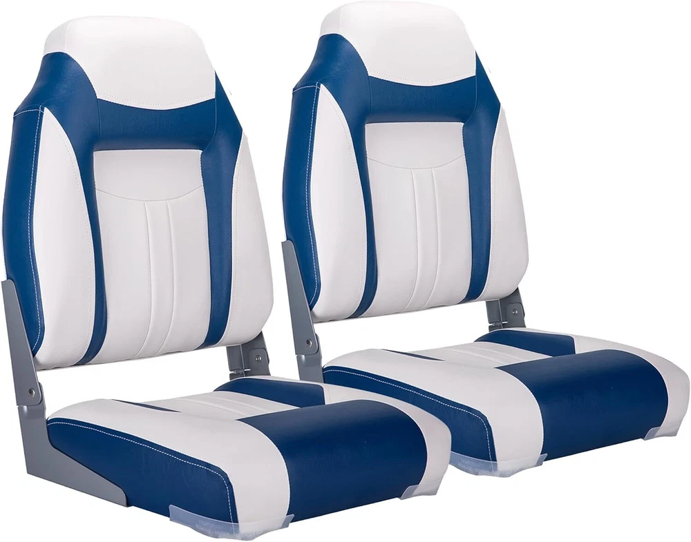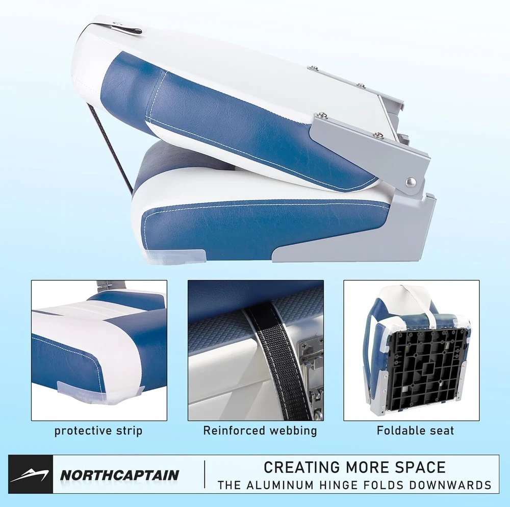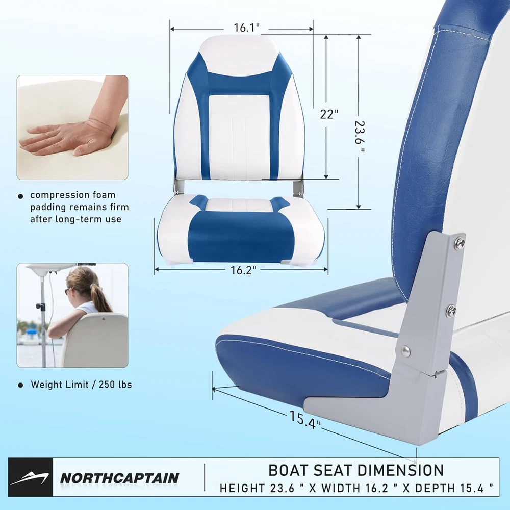 DESIGN:high-back boat seat design ideal for fishing and boating, aluminum hinges enable backrest to be flipped down, creating more space. MATERIAL:Made of marine grade vinyl,compression foam padding remains firm after long-term use. Aluminum alloy hinges and injection seat frame. BOAT SEAT DIMENSION: Height 23.6 ” X Width 16.2 ” X Depth 15.4 ”, Weight Limit :250 lbs. DURABLE: durable seat can withstand the long-term rigors of a marine environment. INSTALLATION: easy to install on standard 5"x 5"mounting bolt pattern, 4 stainless steel mounting screws included. No swivel/pedestal included. NOTE: Photo may slightly different from Actual Item in terms of color due to the lighting during photo shooting or the monitor's display.