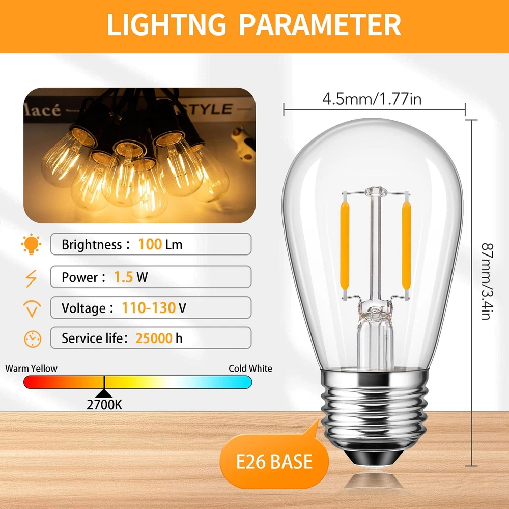 Product Specification: Watts:1.5W (Replace 15W Incandescent Lamp) Dimmable: No-Dimmable Lumen:150lm Color:2700K (Soft White) Beam Angle:360 Degree CRI:80+Ra Voltage:AC 110V-130V Base Type: E26 Medium Screw Base Package: 15 Packs of S14 LED Bulbs Application Commercial Use: Hotel, cafe, commercial buildings supermacket theaters shop-window and artwork lighting. Home Use: Bathroom, bedroom, Kitchen, living room, dining room and dressing room lighing, wall lamps, table lamps and vanity lighting. Outdoor Lighting: The globe replacement light bulb is ideal for outdoor string light. It is perfect for your garden, patio, deck, pergola and outdoor space. Warm tips--These S14 1.5 watt led bulb couldn't work with Solar String Light and other low volatage string light bulbs. 【Energy Efficient & Money Saving】Equipped with energy-efficient LED Filament, these S14 LED Bulbs will reduce heat output and save over 90% on the electricity bill of lighting, which makes it an economical alternative to 10W-15W incandescent or halogen string light bulbs. 【High CRI 80+ & Stable Output】Features high CRI 80+, bring out a vivid and natural color, providing you with a better visual enjoyment. And the high quality of light output will also remain stable throughout the lifetime. It means that the soft warm light bulb will create welcoming and comfortable light for your home. 【Super warm & No Delay】Designed with the latest LED source technology, this outdoor LED light bulb has a output of up to 100 lumens. It will emit full brightness at soft white 2700k with 360-degree light. No delay and no dark space, widely used for such as string lights in backyard, patios, outdoor, indoors bars,garden or other decoration light fixtures. 【Easy To Install & Wide Application】15 Pack LED String Light Bulbs Replacements with E26 screw bases can be easily screwed into the light fixtures directly, optimal choice for outdoor decoration like patio, porch,garden,festoon,camp,party and etc.