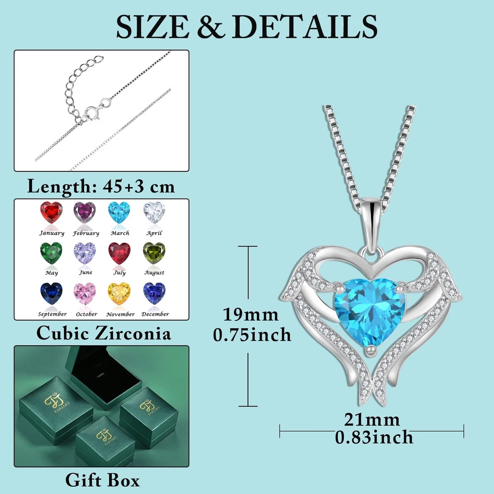 ❤ Unique Design ❤ Angel wing jewelry has gained popularity for it's beautiful symbolic meaning of love, spirituality and protection. Inspired by angel wings and birthstones, meaningful design concepts. Each month's birthstones have good meanings as well as attributes. It's a thoughtful present for mom, wife, daughter, sister, girlfriend, best friend or yourself. ❤ High Quality ❤ Material: 925 sterling silver with AAA cubic zirconia, which is hypoallergenic and will not get dark or change color. ❤ Suitable Size ❤ Chain Length: 45+3 cm. Pendant Size: 19 * 21 mm / 0.75 * 0.83 inch. Birthstone Size: 8 * 8 mm / 0.31 * 0.31 inch. ❤ Perfect Gift ❤ Delivery with a delicate gift box, a Perfect Gift for Valentine's Day, Anniversaries, Birthday, Mother's Day, Graduation Season or Christmas! ❤ Without Worry ❤ If you have any question or problem about the item, please contact us. We will reply you within 24 hours.
