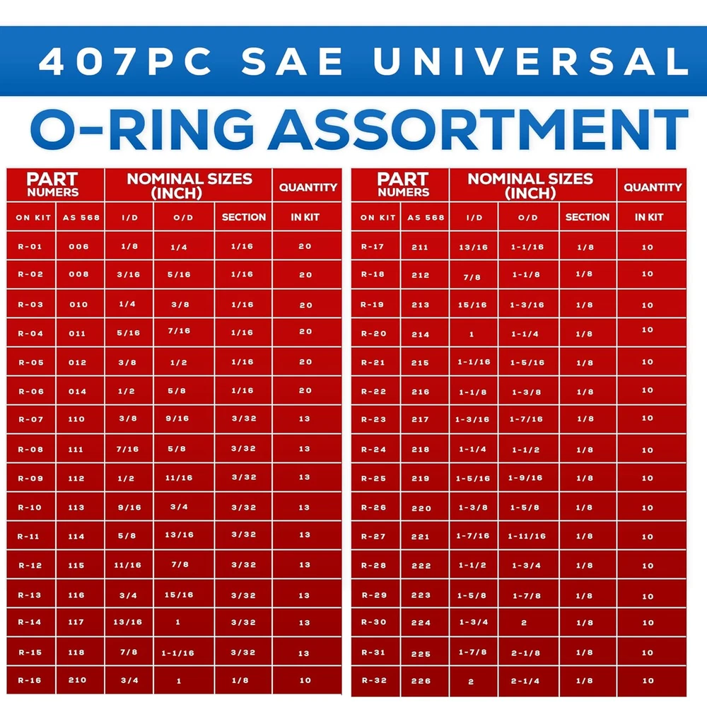 Store New Arrivals Add to Favorite View Feedback Contact SAE Metric Rubber O-Ring Washer Assortment Kit Automotive Storage Case Oring Set Description Item model number 826pc Material Nitrile rubber Number of Items 826 Nominal Outside Diameter 2 Inches Item Diameter 3 Millimeters Country of Origin China Nominal Inside Diameter 3 Millimeters Package Dimensions 9.93 x 6.35 x 3.3 inches; 2.55 Pounds Is Discontinued By Manufacturer No Nitrile rubber Resists oils, hydraulic fluid and water Includes storage case with o-ring gauge Metric sizes from 3 mm I.D. to 50 mm I.D. SAE sizes from 1/8” I.D. x 1/4” O.D. to 2” I.D. x 2-1/4” O.D. Product Description ABOUT US We offer the best prices around on high quality products. Our E-store includes media such as books, movies, music and games while offering electronics, toys, sporting apparel, clothing, tools, general home, garden items and more. SHIPPING We are always working hard to ensure your package arrives as soon as possible. Please understand that some factors like weather, high postal traffic, and the performance of shipping companies are outside of our control. We offer free shipping to the lower 48 states and ship within 2 business days of payment, usually sooner. We do not accept P.O. Boxes. Please provide a physical address. RETURNS We offer a 30-Day Return Policy on items which you are not completely satisfied with. You have the option for a full-refund or an exchange of the item. No returns are available on items shipped outside of the USA. PAYMENT We accept PayPal. CONTACT US This page content is yet to come Please ad us to your favorite seller and visit again later Thank You CUSTOMER SATISFACTION We try our very best to make sure every customer is completely satisfied. If there's a problem, message us! We're happy to help.
