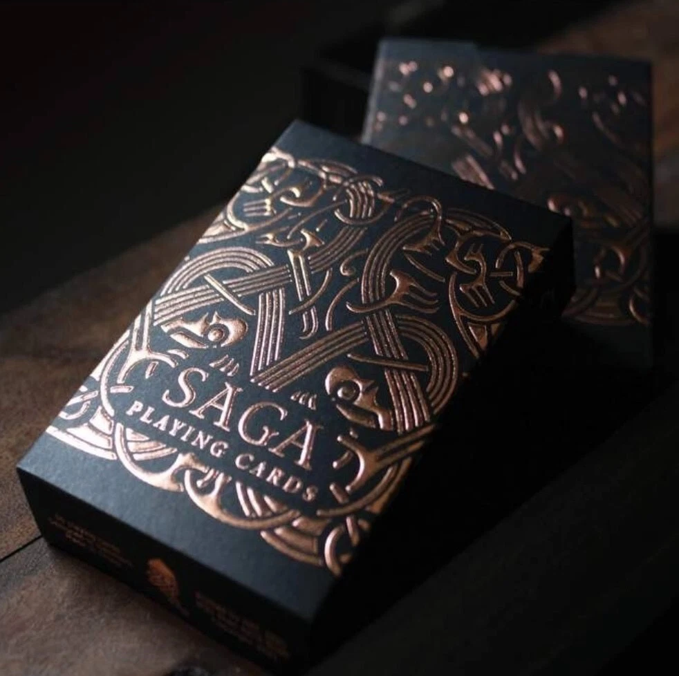 ★ Neo-norse art style by danish designers ★ Embossed tuck boxes with metal foil ★ Exclusive to Kickstarter backers & Isolated Thunderstorm ★ Special matte-raw tuck stocks ★ A new series of decks with great handling ★ 52+3 poker sized playing cards ★ Printed with M31 Linen BETA finish
