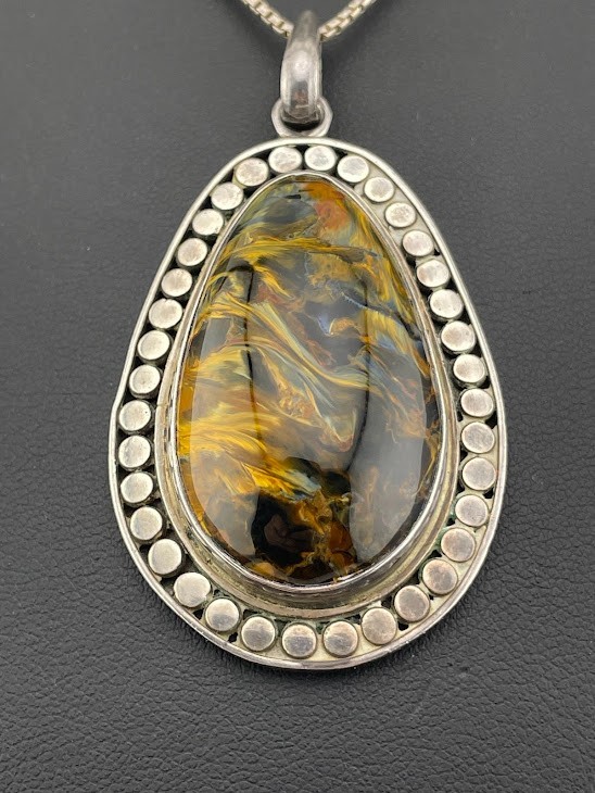 SAJEN 925 STERLING SILVER PIETERSITE TEARDROP NECKLACE 24" AMAZING COLOR 385 ****************************** Thank you for your interest in our jewelry. We'd like to introduce ourselves. We are just a retired couple who love matching our customers with great jewelry. We're not professional jewelers. To have the best shopping experience we like to recommend the following: Please measure your hand, wrist, finger or neck to ensure the best fit. We can use your measurements to help with sizing. Please ask all the questions you want. We know some stuff and, if we don't, we'll do the research. We like to learn too. More Stuff: If an item is described as "gold over 925 sterling silver" this means it is gold vermeil. Vermeil is the process by which a layer of gold (usually 14k or 18k) is bonded to sterling silver. We only clean with gentle soap and warm water to avoid damage. The items we sell may be new or pre-owned and may have normal wear, slight damage, and/or tarnish. We make every effort to ensure the items we sell are as described. This includes testing to confirm metal purity if the item isn't marked, and testing for gemstone identity. We try to put measurements in the jewelry description and include a photo of each piece with a U.S. quarter (25mm).