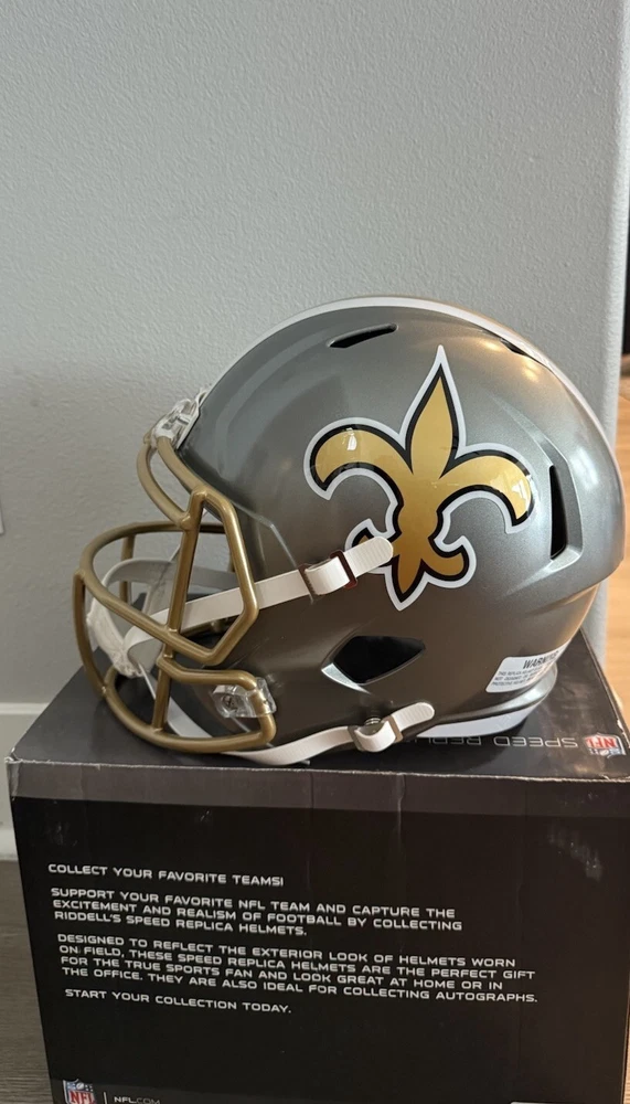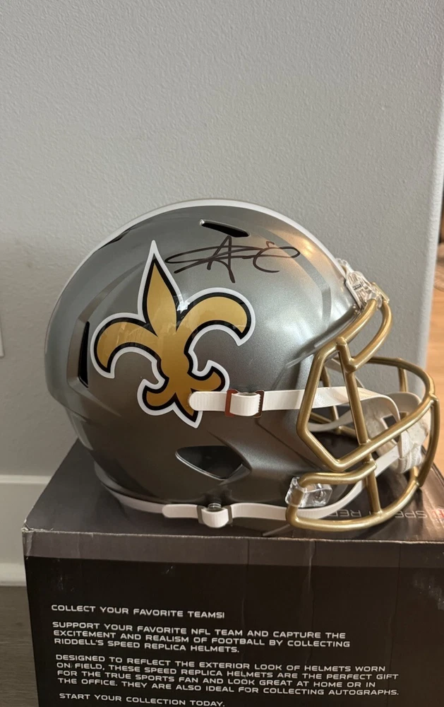 This is a New Orleans Saints Flash Gray Full Size Speed Replica Helmet that has been hand signed by Alvin Kamara. This item has been witnessed and certified authentic by Beckett Authentication (BAS) and comes with their tamper-proof witness sticker.