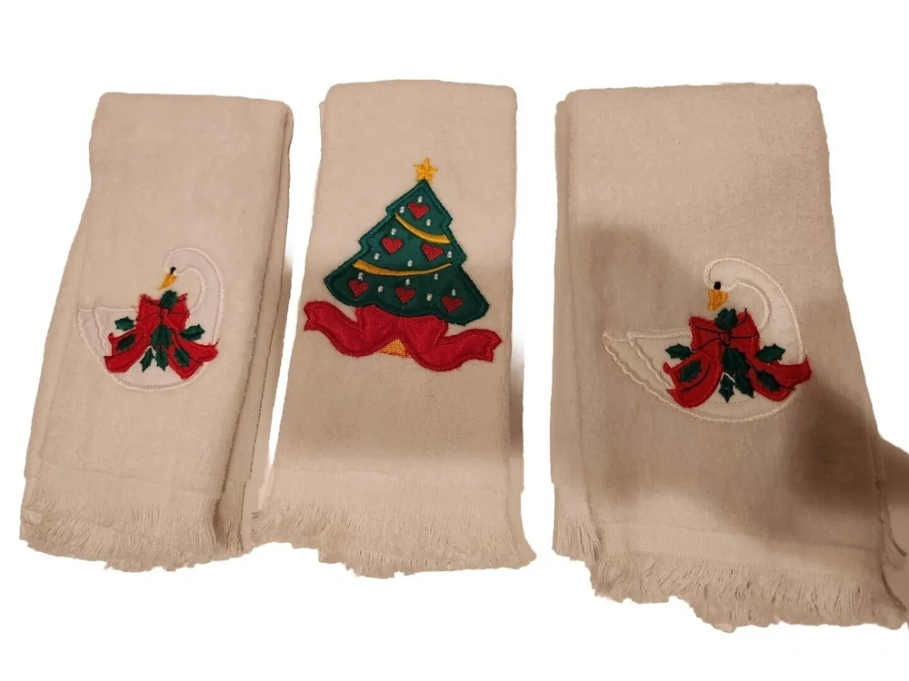 Set of 3 Christmas-themed towels great for for multipurpose use. The rectangular-shaped towels are made of soft terrycloth material with small fringe edge and feature embroidered patterns of a Christmas goose and holiday tree. The set includes 3 towels that are 18 inches in length and have a width of 10-15 inches. Care for them by washing with like colors and tumble dry low.