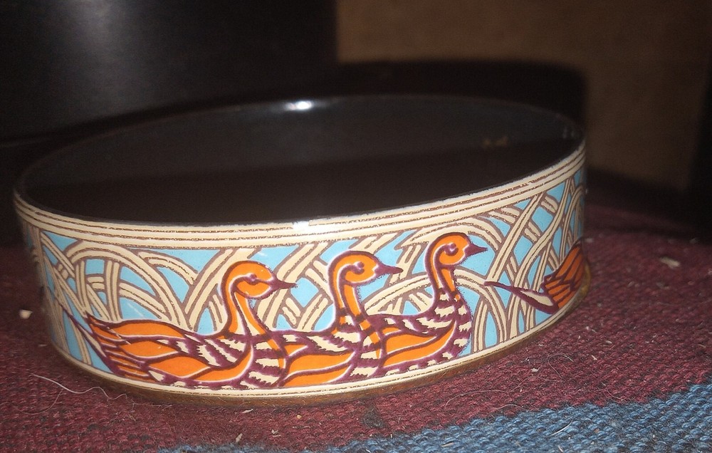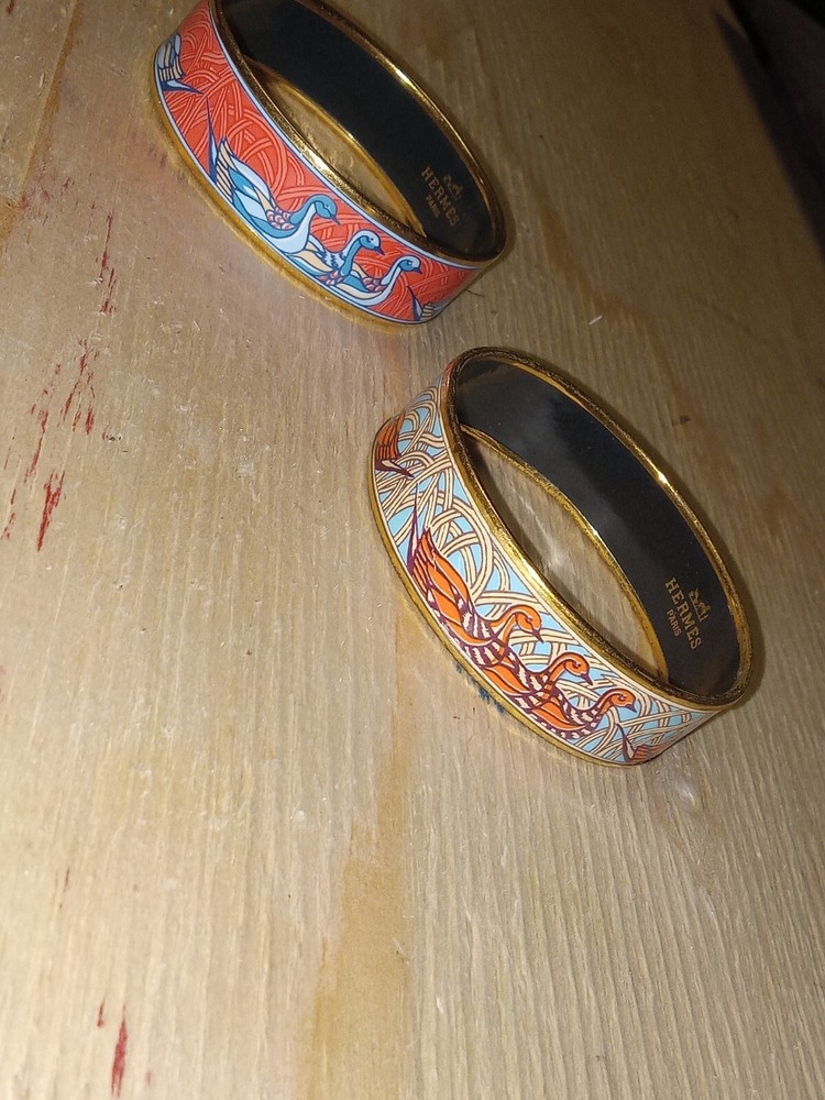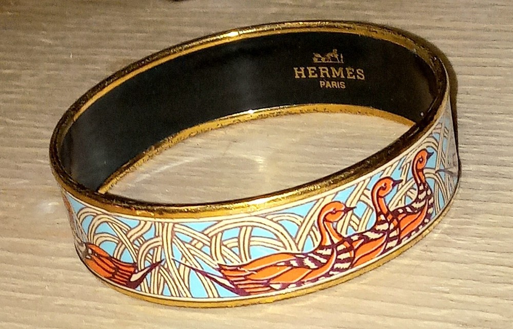 Hermes Paris Gold Enamel Bangle Bracelet , Size 70mm, made in Austria. RARE discontinued ducks bangle Vintage Hermes Made of enamel with gold trim Size 70mm ( Large ) Preowned, but we'll maintained A few hair sized scratches in gold trim This bracelet is very hard to come by in this color!! Only 1 available!! Open to offers