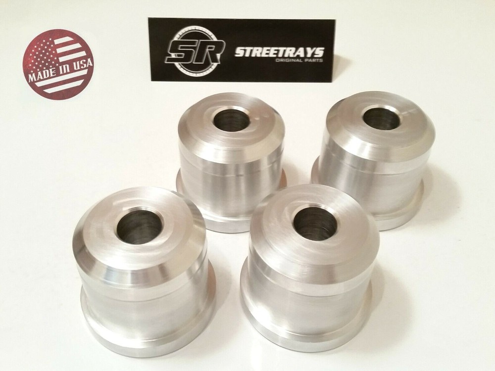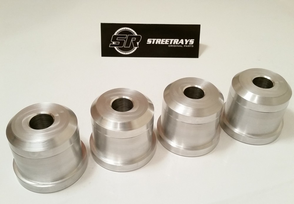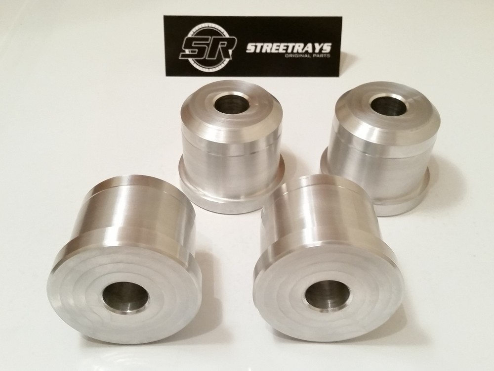 StreetRays [Originals] Solid Aluminum Rear Subframe Risers Bushings FOR 89-98 240SX FOR Nissan (S13 & S14) 240SX 89-98 100% CNC Machined Finish StreetRays [Originals] parts are 100% machined right! here in Central Texas. Quality raw material as well as precision machining is the #1 ingredients for all our parts. Here are some of the reasons why you would want to consider installing StreetRays [Originals] solid rear subframe bushings. A significant amount of suspension dynamics are compromised when energy is transferred to the shifting subframe instead of being directed towards the dampers (coilovers). Replacing worn out and old rubber bushings with these solid billet aluminum bushings (made from AL6061 T6) will result in better suspension feel and response that a driver would prefer during competition. StreetRays solid bushings are machined with a longer "lead-in" to help users without shop "press", the lead-in will help guide the bushings into place for a slightly easier installation process. Please note that installation instructions is NOT included because most of the steps can be found either online in forums or Factory service manual. The hard part is to remove the subframe and prepping it, so that the solid bushings can be "pressed" into place. Users may also consider freezing the solid bushings and pound them into place with a large hammer & wood blocks (to prevent damage to subframe). But you will gain a lot with this upgrade, these will improve your roll center, anti-squat characteristic, and likely eliminate wheel hop altogether. As an added bonus, our solid bushings will also raise the subframe up to the chassis to allow a more proper (corrected) positioning of suspension arms on lowered cars. Having the suspension arms at a proper angle in relation to the ride height is very important in the suspension dynamics during wheel travel. Important NOTE: This is for competition uses only and thus, these bushings will have a lot more NVH (Noise Vibrations and Harshness) transferred into cockpit / driver seat. Applications: FOR Nissan 240SX S13 FOR Nissan 240SX S14 FOR Nissan 180SX