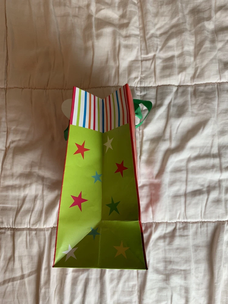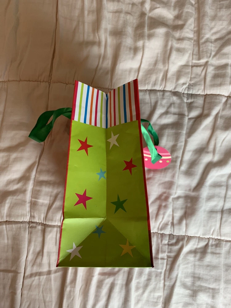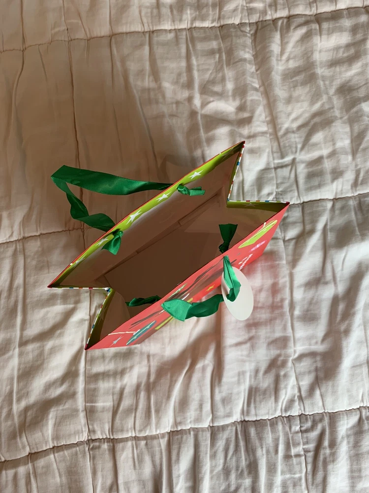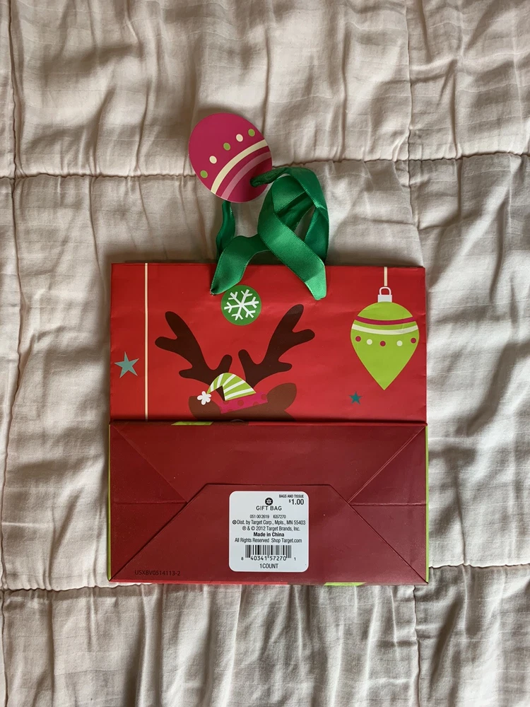 Clearance sale small red Christmas/holiday gift bag with blank name tag with green ribbon handle. 7 x 7 inches. Coated paper bag. Pre-owned. Good condition. As is.