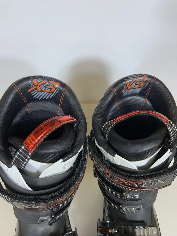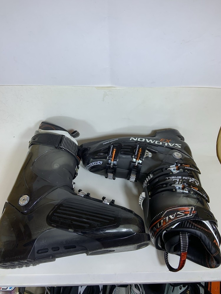 The SALOMON X3 100 CS SKI BOOTS in men's size 27.5 are designed for alpine/downhill skiing with a stiff flex for more control on the slopes. These ski boots feature a 2-piece shell design with a power strap closure for a secure fit. The black boots are compatible with alpine bindings and are suitable for all mountain riding style. Made by Salomon in 2012, these ski boots are a reliable option for serious skiers looking for a high-performance gear for their adventures on the slopes.