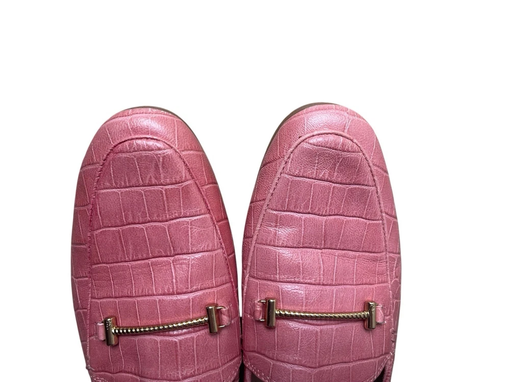 Just got these adorable pink loafers and they're even cuter in person! The croc embossed leather gives them such a nice texture, and they fit my size 5.5 feet perfectly. So comfortable right out of the box and arrived super fast. Love that I scored these pre-owned - such a great find!