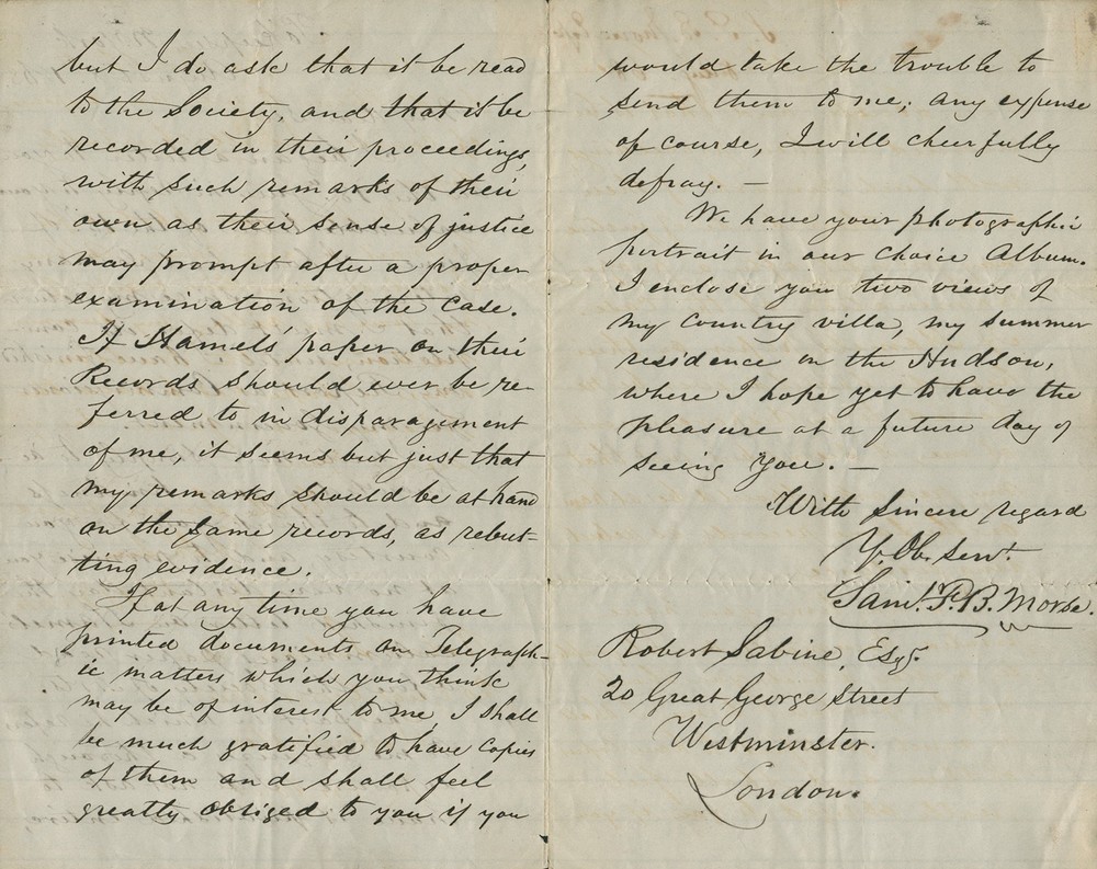HistoryForSale sm Autographs & Manuscripts Make an Offer Today and Get a Quick Response! SAMUEL F. B. MORSE - AUTOGRAPH LETTER SIGNED 08/08/1868 - HFSID 285860 SAMUEL F.B. MORSE Signed, handwritten letter to telegraphic expert Robert Sabine (1868), insisting that he be given journal space to refute "Hamel's calumnious paper read before the Society of Arts". ALS: "Saml F.B. Morse, 3 pages, 5x8. Po'keepsie, N.York, 1868 August 8. The inventor of the Morse Code who established a telegraph line between Washington, D.C., and Baltimore in 1844 writes to Robert Sabine, Westminster, London. In full: "I began a letter to you on the 18 th July in reply to your valuable letter of the 18 th of June. I have had so many interruptions since my return that I must defer its completion, until I have finished by Report as Commissioner for my Government. I write now simply to acknowledge your kindness and to thank you for your courtesy, and to promise you at no very distant day the finished letter on Hamel's calumnious paper read before the Society of Arts. The part in which he refers to me, requires a thorough exposure. I do not ask to have it published entire, but I do ask that it be read to the Society, and that it be recorded in their proceedings, with such remarks of their own as their sense of justice may prompt after a proper examination of the case . If Hamel's paper on their Records should ever be referred to in disparagement of me, it seems but just that my remarks should be at hand on the same records, as rebutting evidence. If at any time you have printed documents on Telegraphic matters which you think may be of interest to me, I shall be much gratified to have copies of them and shall feel greatly obliged to you if you would take the trouble to send them to me; any expense of course, I will cheerfully defray. We have your photographic portrait in our choice Album. I enclose you two views of my country villa, my summer residence on the Hudson, where I hope yet to have the pleasure at a future day of seeing you." Samuel F. B. Morse (1791-1872) was an accomplished portrait and mural painter and founder of the National Academy of Design . On a trip to Europe in 1830, while observing French semaphores, and realized that messages could be sent even more quickly using an electrical spark. In March 1843, he won a grant from the US Congress to build the first telegraph line. He sent the first successful telegraph message from Washington, D.C. to Baltimore on May 24, 1844. His code for message transmission became, of course, the system of dots and dashes known as Morse code . Morse built telegraph lines across the country while battling rivals in the courts. Robert Sabine was an English science writer who had recently published a book on the telegraph ( The Electric Telegraph , 1867). That same year he produced a report for the British government on telegraph techniques shown at the Paris Universal Exhibition of 1867. The Hamel Morse denounces in this letter was probably Joseph Hamel, a scholar at the Russian Imperial Academy who kept the Czar informed of technological developments in the West, including telegraphy and photography. Hamel has been called "the first industrial spy." Light show-through from mounting remnant on verso of third page, usual folds, slight separation at bottom of vertical fold and at blank portion of third page above but not touching signature, else fine. See additional material from these signers: SAMUEL F. B. MORSE See 1,198 other listings in these categories: SCIENCE & MEDICINE WEEKLY SPECIALS Please note that this is an authentically signed item. We do not sell autograph copies or signature reprints. Click main eBay images to see larger versions Images shown may contain our company watermark. The actual item does not contain this watermark. Certificate of Authenticity This item has been authenticated and is accompanied by a Certificate of Authenticity issued by our parent company, Gallery of History, Inc. We financially stand behind our COA. Our commitments to authenticity and customer satisfaction are the reasons we've been able to stay in business for so long (since 1981). Ask us about our PSA/DNA and JSA authentication guarantee. Our Third & Best Handbook - Your Guide to Historical Documents Enhance your collecting experience—add this definitive guide to historical documents to your autograph purchase. For both experienced and novice collectors, and for those who simply love learning history, this beautiful 253-page hardcover volume is for you! For more information visit our Autograph Handbook category or click here . Visit Us Today to See Over 40,000 Rare Autographs and Manuscripts! Actors & Actresses Art & Architecture Authors Aviation & Space Business & Finance Explorers & Western Americana Foriegn Leaders Law & Order Military Music & Performers Presidential Religion & Humanitarians Royalty Science & Medicine Sports Supreme Court U.S. Politicians Weekly Specials Gallery of History is the world's largest dealer of authentic autographs and manuscripts. Our inventory contains items in all areas of interest, including presidents, royalty, military, aviation, religion, business, science, celebrities, sports, music, authors, and more. Whether you're looking to add to your collection, acquire a unique centerpiece for the home or office, or find a truly one-of-a-kind gift for someone special, you'll find it here at HistoryForSale. Contact us today and let us assist you in finding that perfect piece. The Gallery of History , founded in 1981, is a long-standing UACC Registered Dealer, #RD110, and is a long-standing member of the Manuscript Society. HistoryForSale: Gallery of History, through its HistoryForSale properties, provides eBay users with the ability to bid on and purchase from an inventory that has been collected over an amazing 44-year period. The Gallery of History is the largest dealer in the world, with an available inventory exceeding 230,000 rare autographs and 
