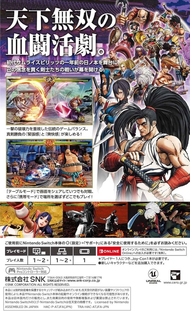 Thank you for visiting our page c18ye2x53oUsed.VeryGood Detail SAMURAI SPIRITS -Switch book form JP [ Condition ] Used.veryGood The world's unrivaled blood-fighting drama is coming to Nintendo Switch! Since its launch in 1993, the "Samurai Spirits" series has gained worldwide popularity as a sword fighting game that uses weapons. After 11 years since the previous work, a completely new work is finally here! While inheriting the world view and gameplay that are the appeal of the series, it has evolved into a new visual expression. That feeling of tension and exhilaration is revived on Nintendo Switch! ■ Set in Hinomoto, the battle between the world's unrivaled swordsmen begins! 16 swordsmen, including all-time popular characters and new characters, will participate. Set in Hinomoto one year before the original Samurai Shodown, a battle begins between swordsmen who stick to their beliefs. ■ Gameplay that pursues ``tension'' and ``exhilaration''! Adopts all-time popular systems such as anger gauge, flash, and secret technique. Pursuing the ``tension'' where a momentary gap can mean the difference between life and death, and the ``exhilaration'' of a surefire blow. Enjoy authentic fighting games on Nintendo Switch! ■With Nintendo Switch, you can enjoy it anytime, anywhere! If you use Nintendo Switch's "Tabletop Mode", you can share the controller with a friend and share the screen. You can play competitively. Also, if you use "portable mode", you can easily play anywhere. Model number: HAC-P-ATJFA Number of players: 1~2 people (2~10 people online) (C)SNK CORPORATION ALL RIGHTS RESERVED. Supported modes: TV mode, table mode, mobile mode Supported languages: Japanese, English, Chinese (simplified Chinese, traditional Chinese) All products in our shop are in Japanese. The language is the Japanese version. [ Brand ] SNK [ Release Date(yyyy/mm/dd) ] 2019-12-12 [ Note : Pre-Order (P/O) ] If title has "Pre-Order", we will ship out as soon as released. We want all buyers to understand there is possibility that the manufacturer will change contents, date and quantity for sale. [ Country of Manufacture ] If "Made in Japan" is NOT described on whole listing page, Items are manufactured in other country (China, Vietnam and etc.). [ Manual & Menu Language ] We treat Japanese Market Usage Items. So items have only Japanese Manual & Menu Language. Please contact us if you would like to know more details. *Japanese Menu Only : Panasonic Camera *English Menu available : Nikon, Canon [ Warranty ] Japanese Warranty Only. Buyers need to send item to us in Japan to repair with warranty & own all shipping cost. If you need to repair item in your country with warranty, please do not order this item. [ Electronics ] Japan Usage Item. Voltage:100V, Plug :Type A, FM Tune:70-90MHz Please check your country's condition for use. [ Multiple sizes and colors ] Before your payment, please contact us about stock of size & color. Payment [ International Buyers - Please Note ] - Import duties, taxes and charges are not included in the item price or shipping charges. These charges are the buyer's responsibility. -Customs and duties: For buyers in the United States: Import duties and taxes are included in the item price or shipping cost. Items shipped to the U.S. are sent under the Delivered Duty Paid (DDP) method, which means all import-related charges are prepaid. You don’t need to pay any additional fees when your order arrives. For buyers outside the United States: Import duties, taxes, and charges are not included in the item price or shipping cost. These charges are the buyer’s responsibility. Please check with your country’s customs office to determine what these additional costs will be before bidding or buying. - Please check with your country's customs office to determine what these additional costs will be prior to bidding/buying. - These charges are normally collected by the delivering freight (shipping) company or when you pick the item up. Please do not confuse them for additional shipping charges. Please pay within 3 days after your purchase. Shipping [ Method ] level country service name speed track number standard worldwide AIRMAIL about 2~3 weeks yes expedited worldwide DHL or FEDEX about 1 ~2week yes [ Shipping Address ] We ship to only address where be registered by ebay. If your address is in a remote area, you will need to pay an additional shipping fee. [ Other Carrier ] We can arrange shipment by DHL and fedex and jp post. Everything comes with a tracking number. We will send you a tracking number once we ship. Please ask us about Handling Time and Price. [ Combine shipping & Large Quantity ] Please contact us for combine shipping & large quantity deals before payment. We do our best for you!!!!! [ Order Processing & Handling Time ] Your order will be shipped within 5~7 business days (excluding Saturday, Sunday & Japan's Holiday) after the payment is confirmed. [ Compensation & Insurance] When you choose EMS, in order to receive compensation, it is necessary to open the box and check your item with delivery staff at the time of delivery. If you don't do that, you may not receive compensation and new item from us even if your item is damaged and lacked. [ Li-ion Battery ] Some countries( Germany,France,Italy,Mongolia,SriLanka,Turkey,Nigeria and more.) does not accept lithium battery via EMS, SAL by Post Office. Please check your country's rule yourself. If we receive order from buyer who located in these countries, we will ask buyer to choose 1 from 3. 1. Ship without Ri-ion Battery removed from item. 2. Change shipping method to Fedex or DHL with additional shipping cost. 3. Cancel