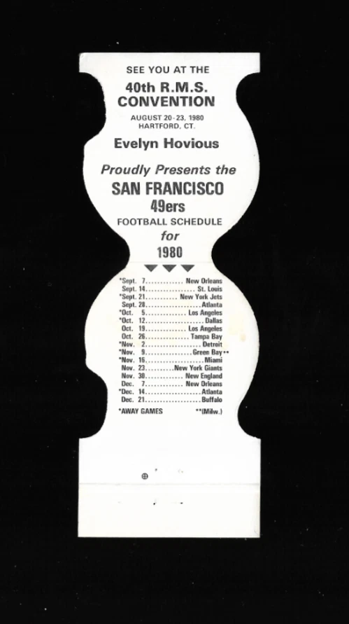SAN FRANCISCO 49'ers 1980 Football Schedule Matchbook Cover Cover will be placed in a top loader & shipped in standard stamped mailing envelope (tracking inc.) please ask any concerning questions International shipping please contact for quote No refunds unless item misrepresented Thank You & Good Luck!