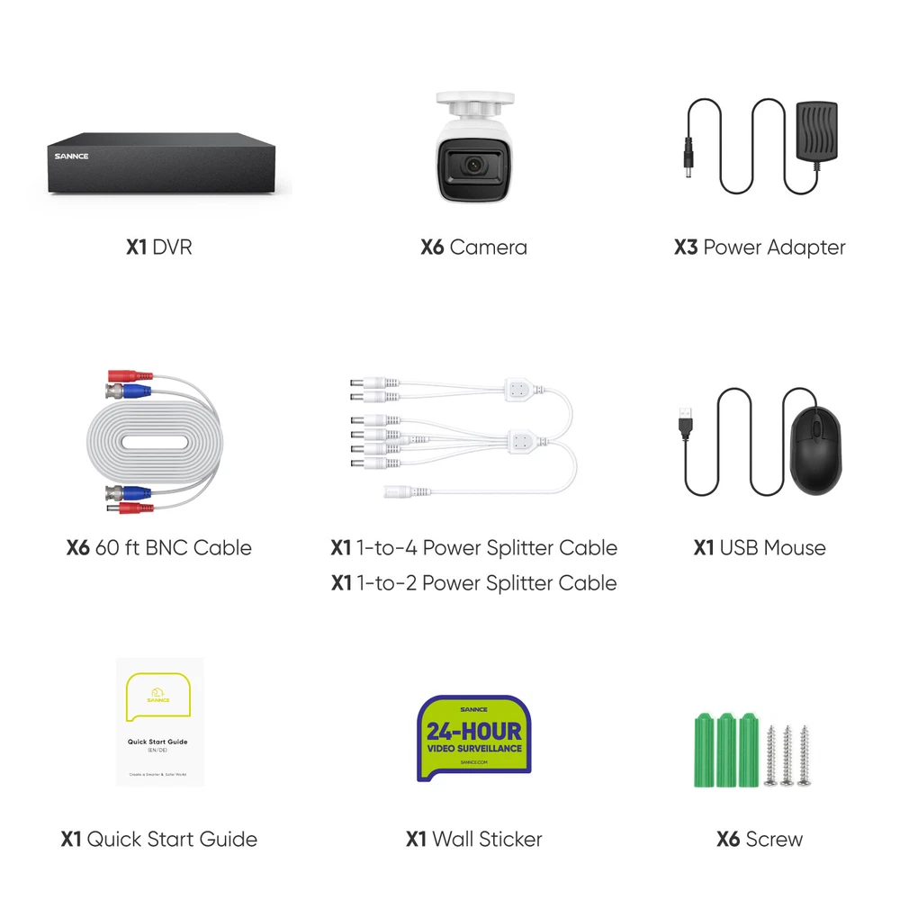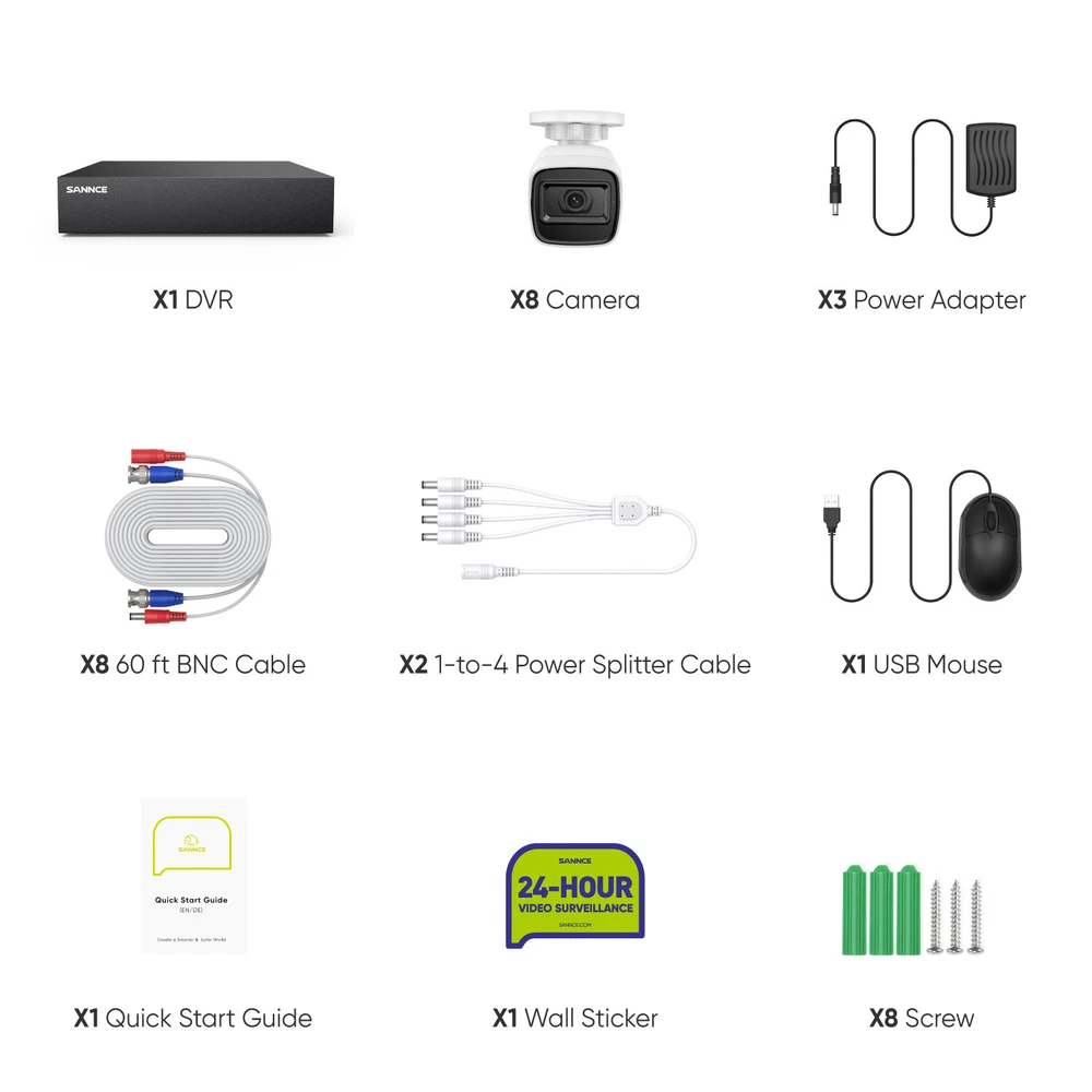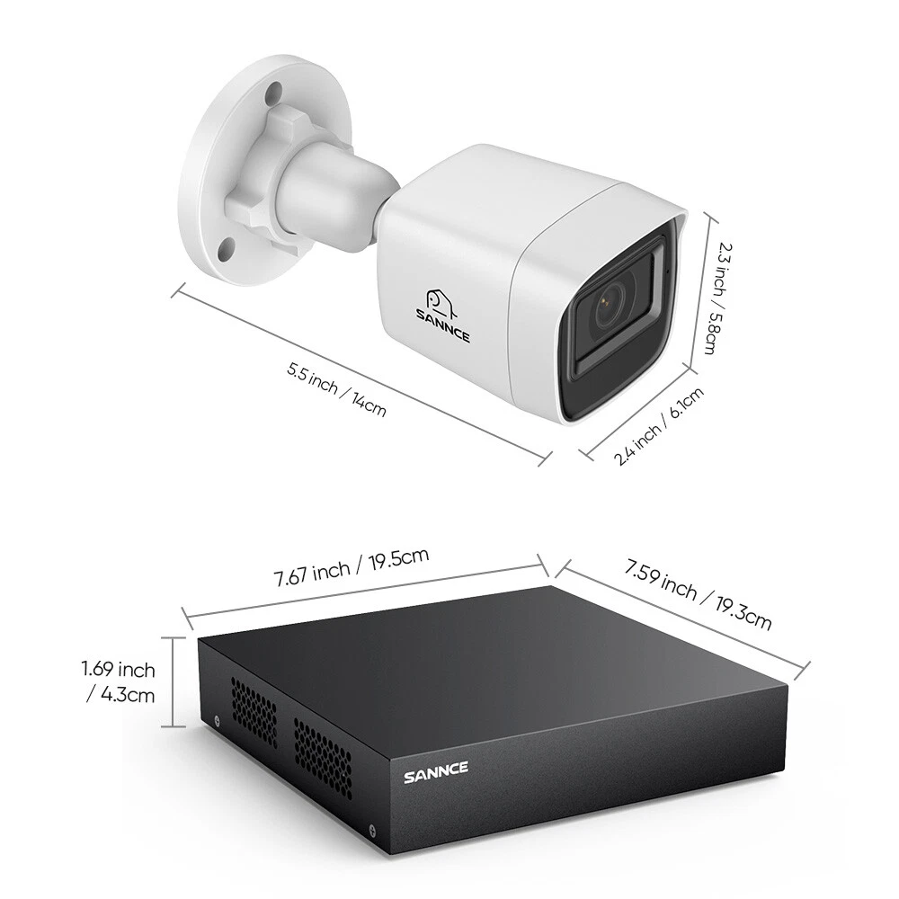 Color Mode: Color Day, B&W Night Min. Illumination: Color: 0.02 Lux @(F1.2,AGC on); 0 Lux with IR on Model: DT81BC-51FE Brand: SANNCE 5IN1 DVR: HD TVI/AHD/CVI/CVBS/IP video input Maximum Resolution: 1920x1080 Video Input: 8CH Analog HD/Analog + 2CH IP (each up to 5 Mbps) Camera Lens: 3.6 mm Video Compression: H.265 Pro+/H.265 Pro/H.265/H.264+/H.264 Type: Bullet MPN: SU-DT81BC-51FE Features: Infrared/Night Vision, Wide Angle, Weatherproof, Motion Detection, Night Vision, Outdoor/Weatherproof, Waterproof, Wall Mounted, Multiple Language Support, Smart AI Human&vehicle Motion Detection, IP67, Email Alert, Multi-Channel Playback Angle of View: horizontal FOV: 73°, vertical FOV: 39° Smart Home Protocol: Infrared Power Source: Wall Plug-In IR Night Vision Distance: Up to 66ft/20 m Connectivity: Wired Number of Channels: 8 Color: White Manufacturer Warranty: 3 years Max Playback Channel: 8CH (1080 lite) Surveillance DVR Feature: 1080P Lite TVI, 5in1, HDMI, P2P, QR Code to Remote Access Surveillance Technology: CCTV Remote View: iPhone®, iPad®, Android™ PC: Support Windows IE Location: Indoor/Outdoor Storage Capacity: NO HDD, 1TB, 2TB, 3TB, 4TB Items Included: Alarm, Camera, Infrared Detector, Motion Sensors, Remote Control Number of Infrared LEDs: 1 Video Output: HDMI up to 1080p/60 Hz