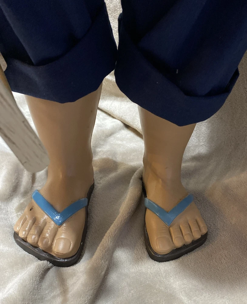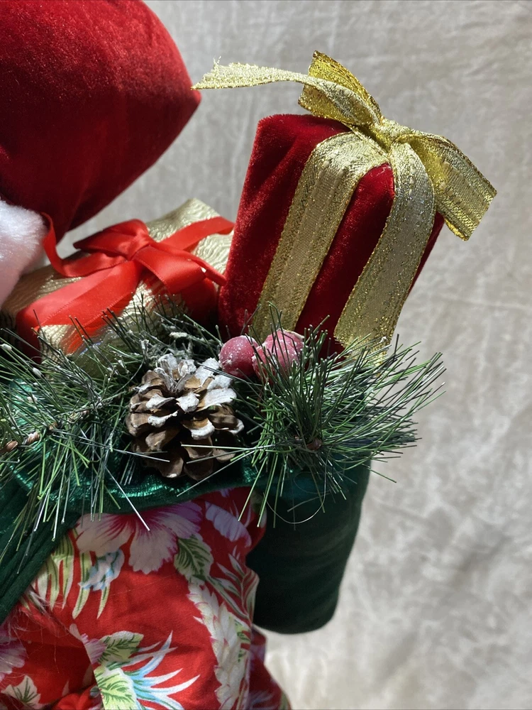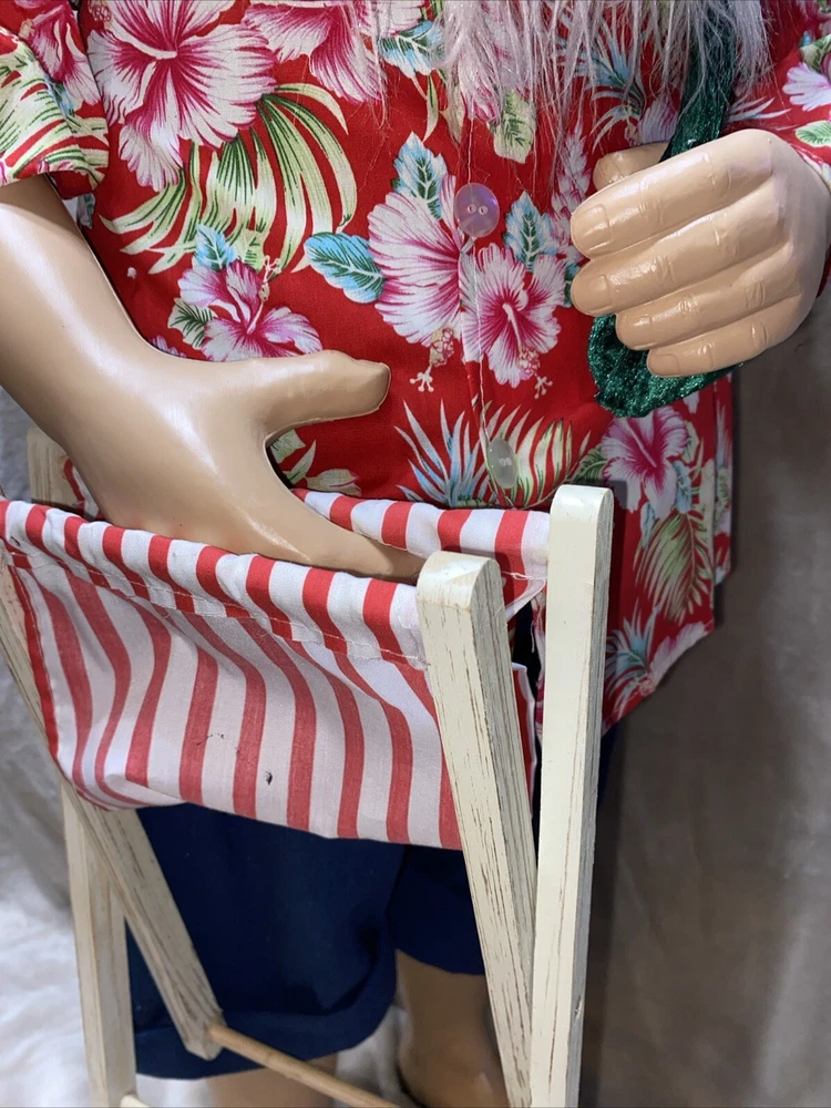 Beach Santa Claus 36” store display / greeter. He’s adorable and very well made. Wearing a Hawaiian shirt and carrying his sack of presents and his beach chair. Wearing his Santa hat and sunglasses can easily be added. Note the small spot on one of his feet. Other than that, no imperfections I see. Store Display Light weight not heavy Chair movable folds out Super cool display for office business Home school Great Christmas present Birthday gift Surf shop Surfer Beach home Resort Tropica Red and white striped Beach chair