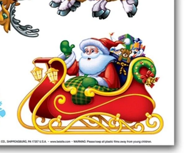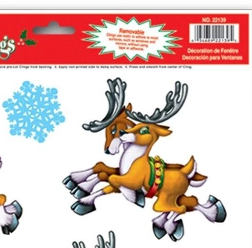 Beistle SANTA SLEIGH with REINDEER and SNOWFLAKES WINDOW CLINGS Kids Classroom Christmas Holiday Party Decorations Santa Sleigh Clings. Santa riding across the world on a cold winter's night in his sleigh along with his eight trusty reindeer! You ft.ll receive Santa riding in his red sleigh, with his gift bag of toys, eight of Santa's trusty reindeer, and several snowflakes. A total of (10) clings on a sheet. Cling Sizes: Reindeer, 5" x 5". Santa, 7" x 5". UPC: 034689221395 MPN: HH-BG-22139 Get ready for the holiday season with these adorable Santa Claus Reindeer Sleigh window decorations from Beistle. Perfect for any room in your home or office, these decorations are sure to bring a smile to your face and to your guests. The set includes all 8 reindeer and sleigh with waving Santa window clings, all made from durable vinyl and plastic materials that are easy to clean with just a damp cloth or warm water. Measuring 17 inches in length and 12 inches in width full sheet, these decorations are designed for horizontal orientation and are suitable for kids, adults, and everyone in between. Whether you're throwing a Christmas party or just want to add some festive cheer to your school classroom or living space, these window decorations are a must-have. So why wait? Order yours today and start spreading the holiday spirit!