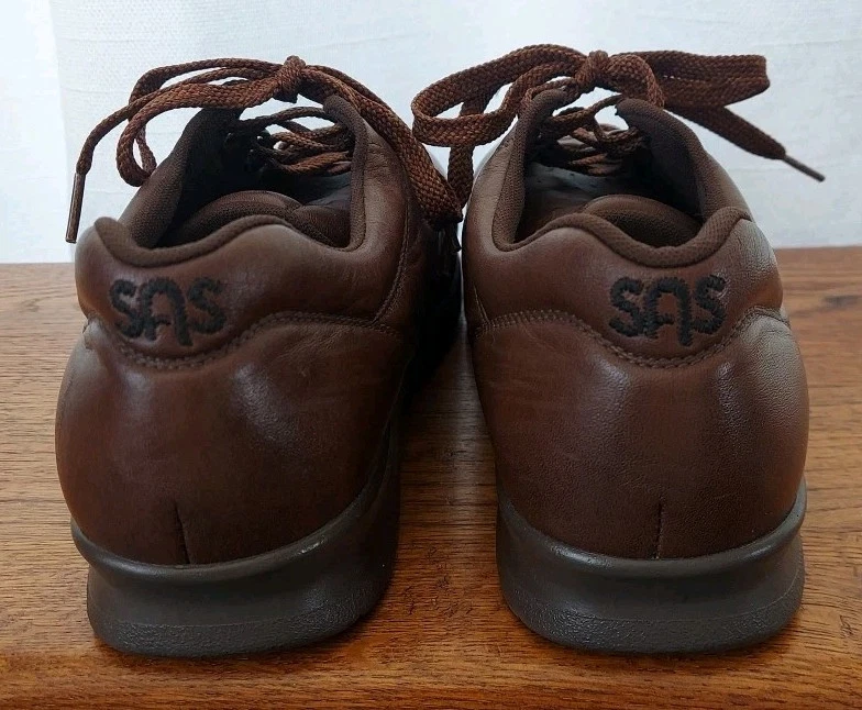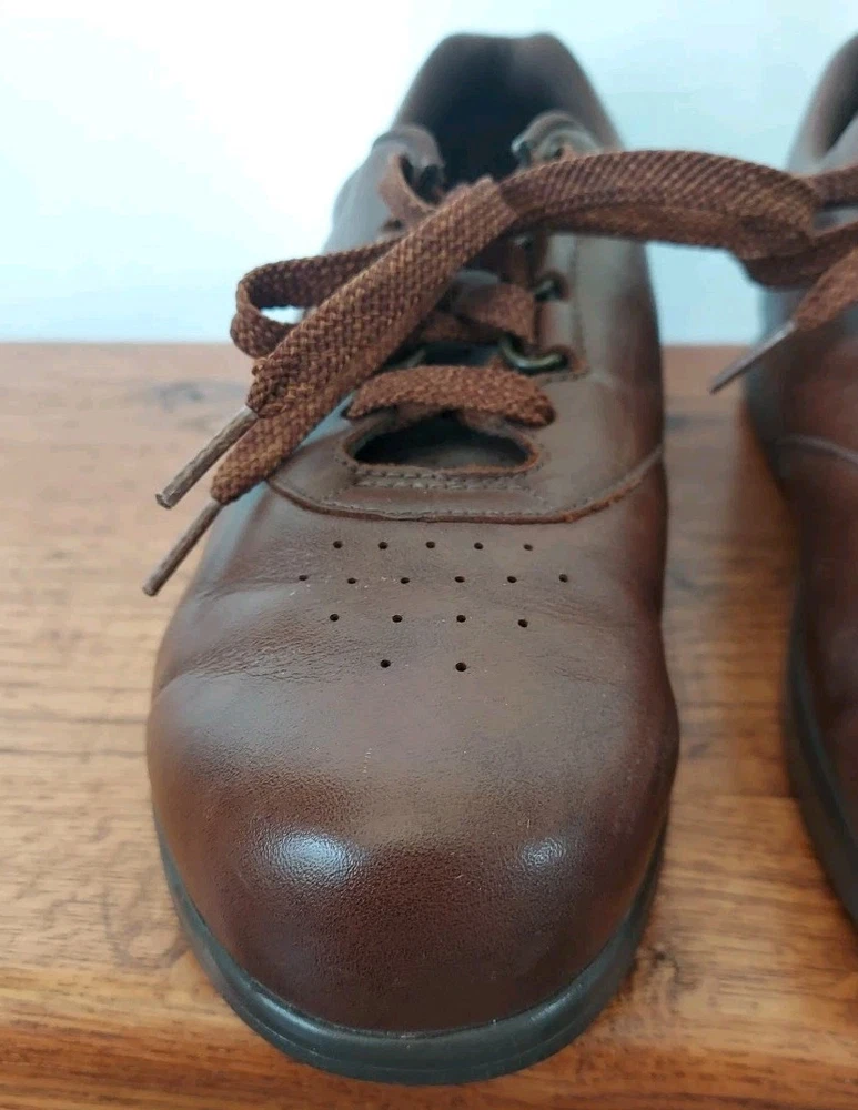 These are SAS Free Time Women's walking shoes in a teak brown color. They feature a solid pattern, round toe shape, lace-up closure, and low heel height. Made of leather with a polyurethane outsole, they offer maximum cushioning and arch support. These comfortable shoes are suitable for travel, activewear, casual, and workwear occasions. The shoes have a removable insole, which have been removed. Buyer can use their own insoles or purchase insoles from SAS website. Handmade in the United States, they are designed for walking activities. *Slight/minimal scratching in leather as shown in photos, extra padding added by previous owner-price reflects this*