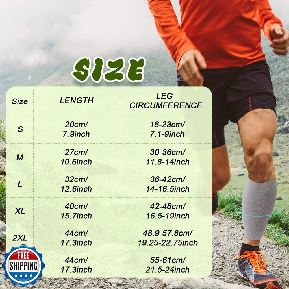 SATINIOR 4 Pairs Calf Compression Sleeve Leg Compression Sock Calf and Shin Support Relieve Calf Pain for Men Women Running (Black, Gray, Army Green, Coffee, Medium) Features Practical functions: this calf compression sleeve can wrap and support your legs to prevent any shaking or injure, bringing you much convenience and bringing you a nice using effect Comfortable Material: this leg compression sock is made of polyamid material, which is soft and breathable, lightweight and provide a comfortable wearing experience, We provide different size to meet the needs of different groups of people, so you don't have to worry about getting it in, breathable fit, making you more comfortable during the sports Anti slip design: non slip design of the calf compression sleeve can hold up the position all the time, which allows you to wear them for a long time without falling off, helping you enjoy the sports Package contents: you will receive 4 pairs of comfortable and soft leg sleeves in classic colors, enough quantity for your daily wearing and replacement. Please refer to the size chart to choose the correct size, the sizes are measured manually, there will be an error of 1-2 cm Wide ranges of uses: these leg compression socks are nice for cycling, basketball, football, climbing, walking, tennis, climbing mountain, wall, also very suitable for long time of runs Shipping Free & Fast Shipping: We offer free shipping to most of the USA with a normal delivery time of 3-7 days. However, due to the current situation, additional delivery time (up to 3 weeks) may be required for some items. Alternative Carriers: We may use alternative carriers (e.g., USPS, FedEx, UPS) to ensure your package arrives safely and on time. Due to the use of multiple carriers, we are unable to provide a tracking number automatically. Handling Time: Orders are processed and shipped within 1-2 business days of receiving cleared payment. Shipping Restrictions: Shipping to Alaska, Hawaii, Puerto Rico, Guam, and other US territories may incur shipping charges or delivery restrictions. Please contact us before ordering, or your order can be refunded/cancelled. State Restrictions: Certain items may not be shipped to California due to state regulations. Contact for Tracking Updates: If you require tracking updates or have any concerns about the delivery of your order, please feel free to contact us, and we will be happy to assist you. Return Policy 30-Day Hassle-Free Returns: If you are not completely satisfied with your purchase, you can return the item for free within 30 days of receiving it for a full refund or exchange. Easy Return Process: Contact us, and we will provide you with a prepaid return shipping label and detailed instructions. No Restocking Fee: There are no restocking fees for returns. However, the buyer is responsible for return shipping costs if the return is not due to a seller"s error. Refund Processing: Refunds will be processed within 1 business day of receiving the returned item in its original condition. Feedback Your feedback is extremely important to us. We strive to provide the best products and customer service possible. If you are satisfied with your purchase, please take a moment to leave us a positive review. If you have any concerns or issues with your order, please contact us before leaving negative feedback. We are committed to resolving any problems and ensuring your satisfaction. Contact Us If you have any questions or concerns, please feel free to reach out to our customer support team. You can contact us through the eBay messaging system. We are available Monday to Friday, 9:00 am to 5:00 pm EST, and we will do our best to respond to your inquiry within 24 hours. Thank you for supporting our small family business!