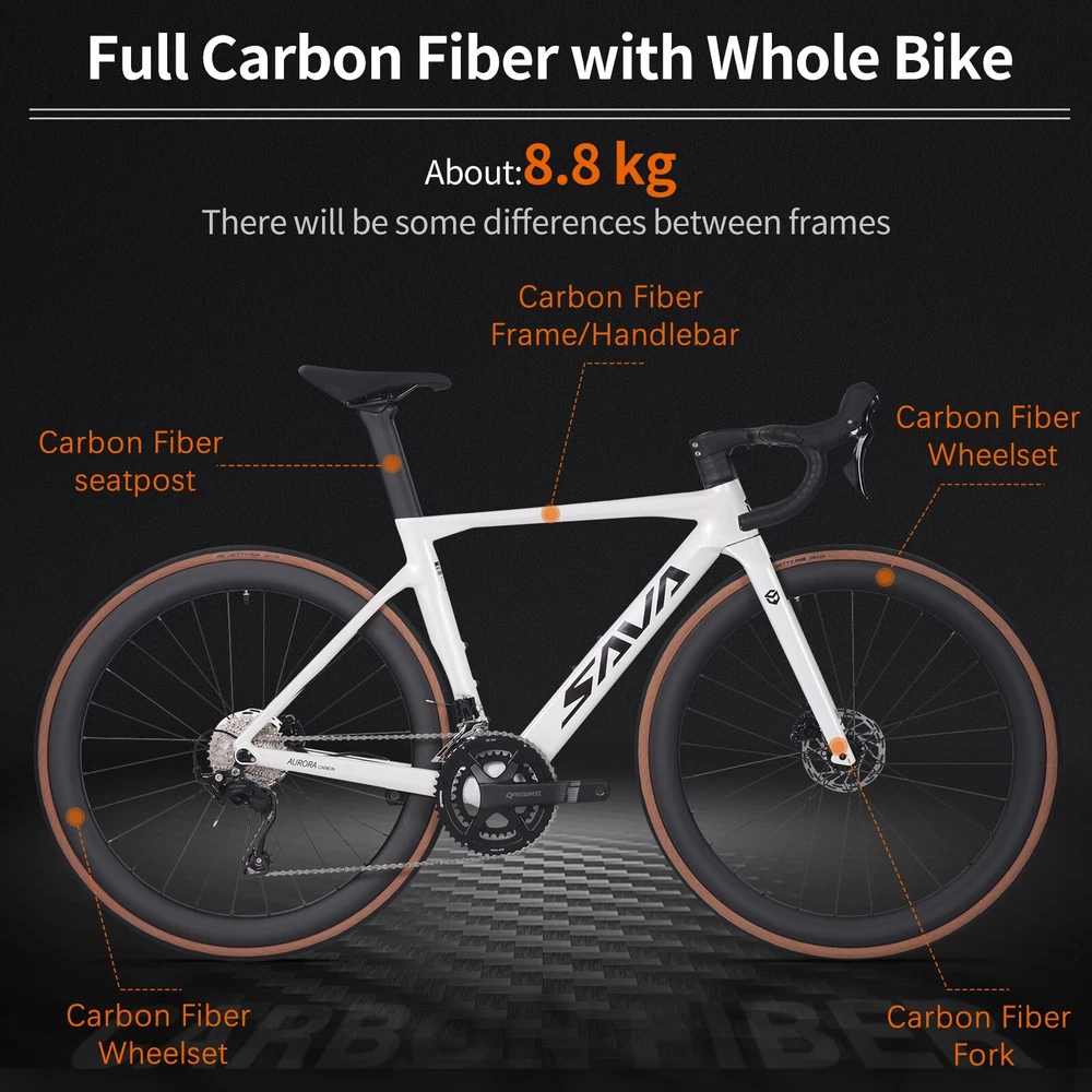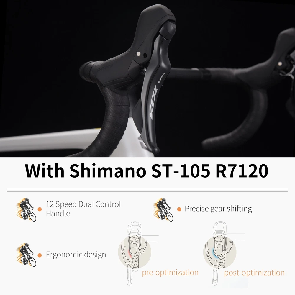 UCI Certificated Carbon Frame The frame has been certified by the UCI and is authorized to participate in any UCI-organized event. shimano 105 ST-R7120 With the mechanical 12-speed components of the 105 series, offers a shifting system for the most diverse types of road cyclists. the ST-R7120 shift/brake levers are not only characterized by the fast and intuitive shifting quality typical of the series, but also know how to convince on an ergonomic level thanks to improved grip and optimized comfort features. shimano 105 FD-R7100 Front Derailleur - 2x12-speed With the mechanical 12-speed components of the 105 series, The FD-R7100 front derailleur is characterized not only by a light, harmonious and at the same time natural shifting behavior, but also impresses with its simple and precise adjustability. shimano 105 BR-R7170 disc brake caliper The hydraulic Shimano BR-R7170 brakes, athletes can test their limits even further. A 10 % larger pad spacing compared to the previous model reduces the risk of unwanted brake friction and grinding brake discs. This reduces overall noise during deceleration, the BR-R7170 calipers not only grip quickly, but also reliably. With 11-32T Cassette With a gear ratio range of 327 %, the 11-32T cassette is optimally equipped for the most diverse terrain requirements. Whether sprints on the flat or steep climbs, with a gradation of 11 to 32 teeth, the 12-speed sprocket set has the right answer for every situation. shimano 105 RD-R7100 Rear Derailleur - Shadow RD | 12-speed With the mechanical 12-speed components of the 105 series. The RD-R7100 rear derailleur combines the harmonious, consistent and nevertheless responsive shifting behavior of the Shadow RD design with Direct Mount compatibility and a wider ratio range, the Top Normal rear derailleur also enables energy-saving transmission with a ratio of less than 1:1, which is ideal for climbing and supports the rider when climbing even steep ramps. Bicycle specification Bike Type: R08-R7120-24S Wheel Size: 700C Frame Size: 47cm/51cm/54cm/56cm Bicycle net weight :8.8kg (pedals not including) Frame material: T800 Carbon fiber Fork: T800 Carbon Fiber Handlebar: T800 Carbon fiber, 400mm x 31.8 mm Shift Lever: SHIMANO, ST-R7120 Front Derailleur: SHIMANO, 105 FD-R7100 Rear Derailleur: SHIMANO, 105 RD-R7100 Crank set: PROWHEEL , 34/50T*170MM Freewheel: SUNRISE 11-32T , Cassette Brake caliper: SHIMANO ,BR-R7170 Brake rotor: IIIPRO Centeral lock Pedal SANYUN :LP-B921 Chain: YBN 12S 1/2"x11/128" Saddle: YBT, PU leather Seat post: T800 Carbon fiber 350mm Wheels: Carbon fibre , 50MM Front hub:M12*100mm, 14G*28H