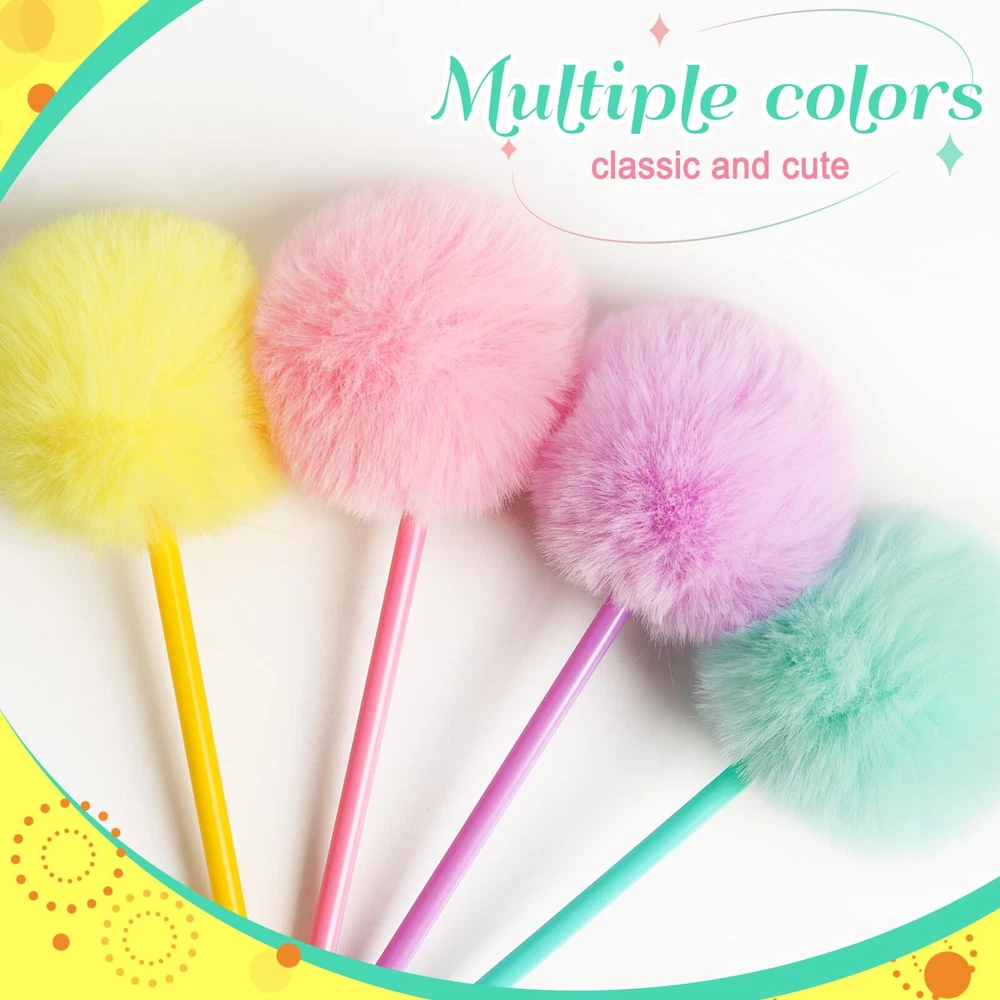 Include: Package includes 4 pcs cute pom pom pens in 4 bright colors: pink,puple,yellow and green Size: Each fuzzy pen measures 8.27 Inch long with a 2.5 Inch large, soft pompom ball Ink color: Dark blue,0.5 mm fine point;Our pompom pens are made of plastic,fun colors and great stationery accessories with smooth writing As a reward: Lovely pom pom pen can be used for everyday note-taking, brain-mapping, doodling and more;They are the best gift for students, classmates, school, home or office supplies Wide use: With these cute fuzzy pens as desk decoration with multifunction fashion style,roller ball ink flows evenly with clear bold fine lines;Enjoyable writing experience with great mood