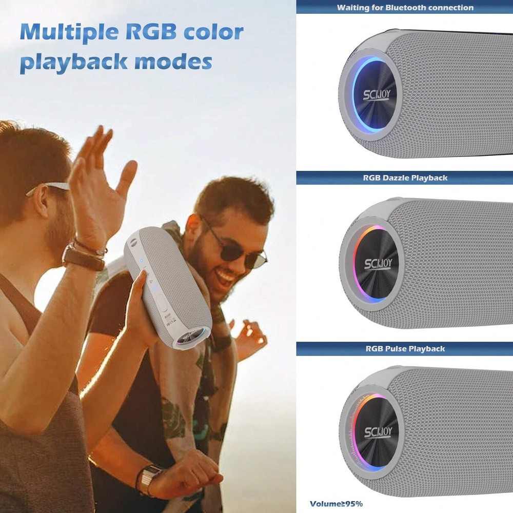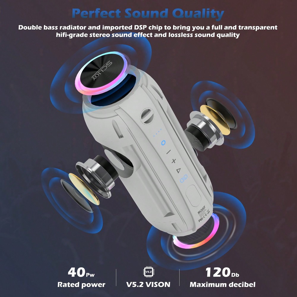 [ Astonishing Sound]40W Bluetooth speaker use advanced digital signal processing chips and dual cavity dual diaphragm stereo drivers, providing clear high-pitched, deep bass, stable midrange. The zero distortion sound effect allows you to fully experience the stunning and loud stereo music scene. [2 Wonderful EQ Smart Modes] The portable speaker bluetooth equipped with two sound integration modes: EQ1 suitable for soft and lyrical music, battery with longer play time. EQ2 enhances heavy bass, suitable for dynamic rock music, with more louder, but with fast power consumption. loud music, select EQ2 mode. With a SCIJOY bluetooth speaker, it is like you have two speakers with different play effects. [True Wireless Stereo]The speakers support two of the same model to pair, achieving more louder play effect and 360° stereo sound, making your party more atmosphere. When the volume of the cellphone and speaker reaches maximum simultaneously, the music will spread to every corner of the room. [Amazing LED Show]Bluetooth speakers with high-quality lights on both sides, which will flicker with the rhythm of the music and present rainbow light show. It creates a great atmosphere for party. Of course, you can choose to turn off the lighting effect when you don't need it. [IPX7 Waterproof]The Bluetooth speaker is superior waterproof that can be used as a good shower speaker. Speakers casing grille is tight, anti slip, and anti fall, sturdy and long lasting, can floating on water, suitable for boating and swimming to use. [Convenient Portable Speaker] The bluetooth speaker is compact, can be hung from a backpack or attached to a bike frame. And large capacity battery provides long life play time for the speaker, making it suitable for camping, hiking and travel etc. [Hands-free calling and Type-c charging]The bluetooth speaker has a built-in microphone to not miss any important call when you are cleaning, cooking and don't have a way to use your cell phone. And improved new Type-c charging port enables fast charging, fully charged in just 4 hours