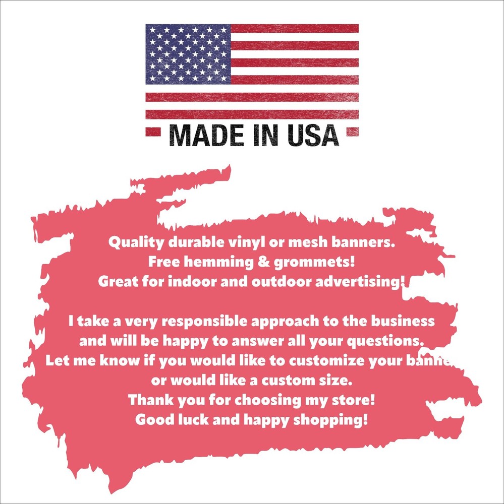 Customize an individual banner (free design) CLICK HERE! We have any banners for you! In my store, you will find more than 5000 ready-made different banners. Just choose what you like best. Quality durable vinyl or mesh banners. Free hemming & grommets! Great for indoor and outdoor advertising! Didn't find the right size? we can make custom banners of any size, just email us via eBay message and we will help you! Choose any size and make an order! I take a very responsible approach to the business and will be happy to answer all your questions. Let me know if you would like to customize your banner or would like a custom size. High-quality banners for a long time: The banners are of high quality, printed on professional equipment using eco-solvent ink. It can be used outdoors and indoors, it is absolutely safe. Our banners have metal grommets around the perimeter of the banner and are ready for installation. It's very easy! Delivery Information: We deliver our finished products using the FedEx or Ups postal service, it's fast and reliable. Usually the delivery time takes 2-5 days from the moment the banner is sent. Thank you for choosing my store: Thank you for choosing my store! Good luck and happy shopping!