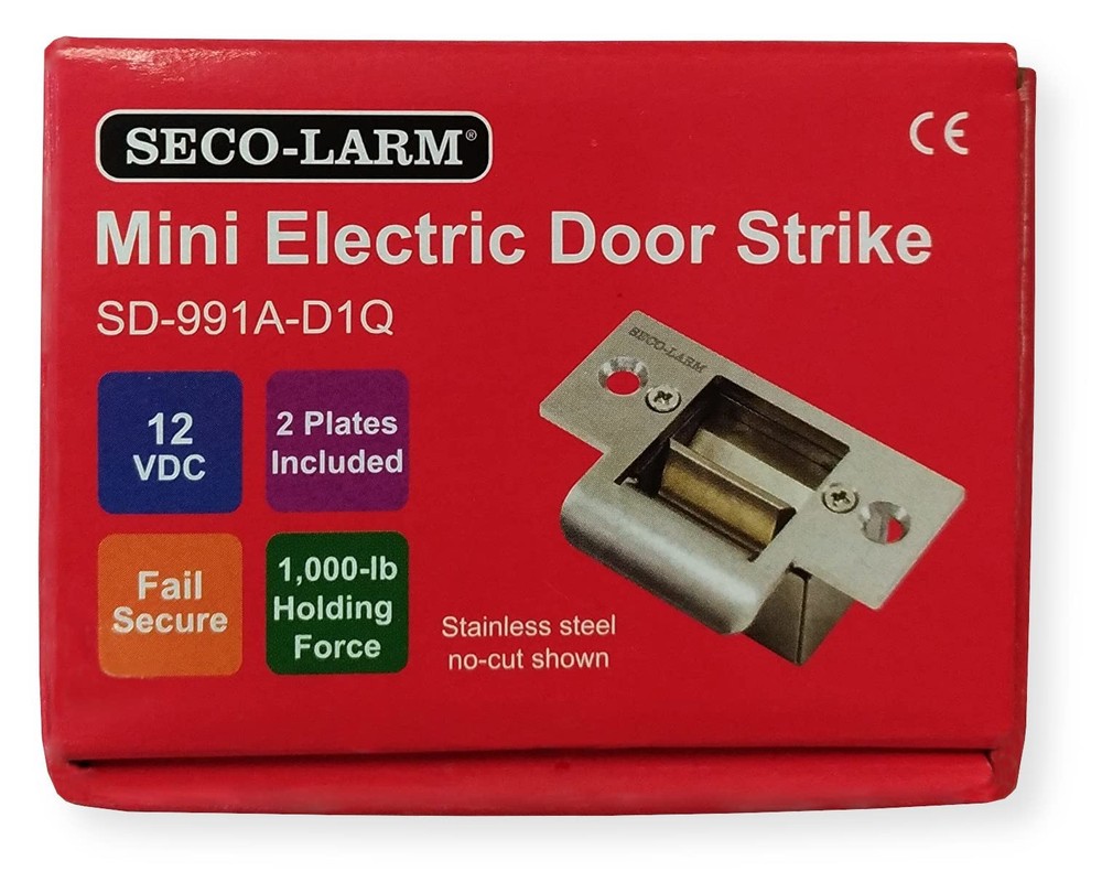 SD-991A-D1Q Mini No-Cut Door Strike For Indoor Use, Converts Cylindrical Lock Sets Into an Electronic Access-controlled Locking System, Stainless Steel Keeper Key Features Converts cylindrical lock sets into an electronic access-controlled locking system Fail-secure operation - Door remains locked if power to the strike is lost 2-wire installation, non-polarized connection Stainless steel keeper for strength and long life Includes Stainless Steel No-Cut and Silver-Colored Aluminum Low-Cut Strike Plates Can be used with virtually any cylindrical door locking system Can be used with an optional digital keypad, pushbutton switch, and other entry devices Suitable for office-type applications Reversible non-handed design fits either right-hand or left-hand doors Shallow design for use with most metal doors Powered by a solenoid, not a buzzer coil For indoor use Specifications Operating Voltage: 12VDC Current Draw: 280mA12VDC Static Strength: 1,000-lb (454kg) Endurance: 250,000 Cycles (Factory tested) Latch Throw: 1/2" (13mm) Operating Temperature: 14°~120°F (-10°~49°C) Operating Humidity: 0~85% (Non-condensing) Dimensions: Stainless Steel No-Cut Plate 2-3/4"x1-1/8"x15/16" (70x28x24 mm) Fail-secure operation - Door remains locked if power to the strike is lost Includes Stainless Steel No-Cut and Silver-Colored Aluminum Low-Cut Strike Plates Can be used with virtually any cylindrical door locking system Can be used with an optional digital keypad, pushbutton switch, and other entry devices Reversible non-handed design fits either right-hand or left-hand doors