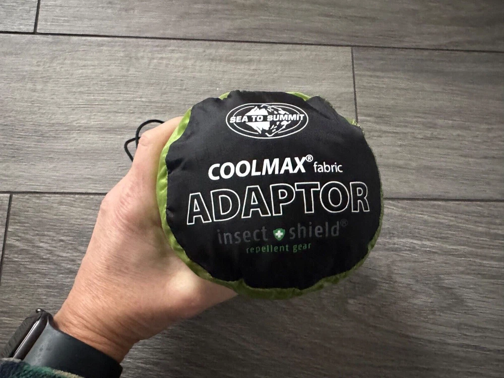 SEA TO SUMMIT ADAPTOR COOLMAX MUMMY SLEEPING BAG LINER WITH INSECT SHIELD, EUC. This Sea to Summit Adaptor Coolmax Mummy Sleeping Bag Liner with Insect Shield is in excellent condition. I came across a container or hiking/camping equipment and am putting things up for sale. I don't know if new or used, however, this liner is in impeccable shape. The Sea to Summit Adaptor Coolmax Liner is a climate control travel liner specifically designed for warm or humid conditions. The Adaptor liner, adapts to varied temperatures and humidity because it's made of Coolmax, a proven moisture management fabric.