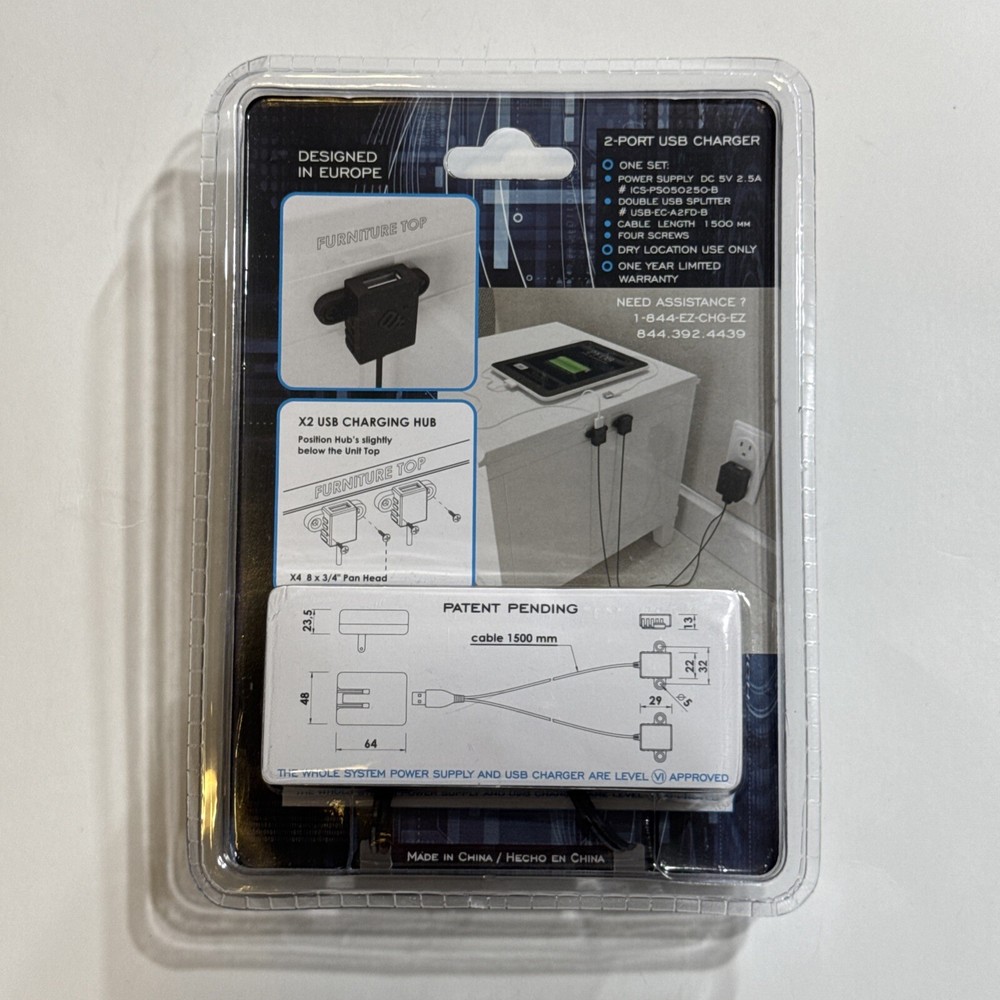 The product is a 2-Port USB Charger from Ez Collection, designed for charging devices via dual USB ports. It comes in a sleek black color and includes a charging cable for convenience. The charger is wall-mountable for easy access and organization. The specific model is labeled as A 2 FD-B, indicating its features and specifications. The product is brand new and sealed, ensuring its quality and functionality for powering multiple devices simultaneously.