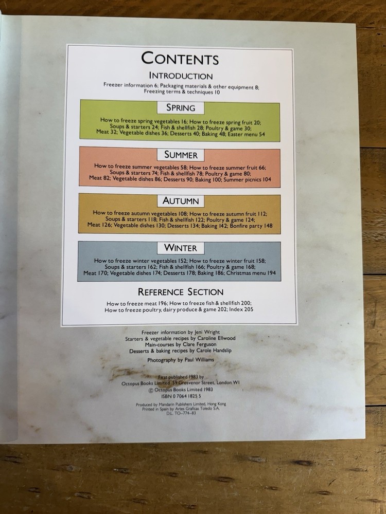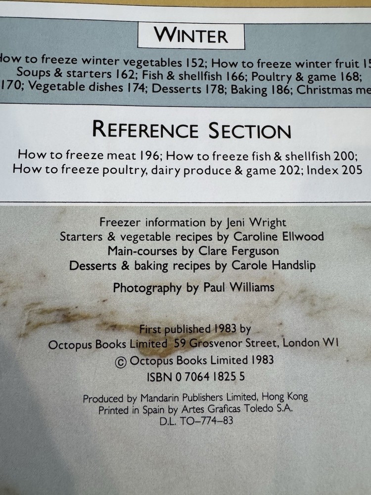 SEASONAL FREEZER COOKBOOK Hardback Book Jeni Wright Freezing Technique Free Post PLEASE CHECK PHOTOS books can be creased, discoloured, have foxing, be water damaged, bindings may be frayed and there may be sticker damage. I make sure that I take photos of the wear & tear so please check photos or otherwise if you have any questions, do not hesitate to send me a message. Thank you
