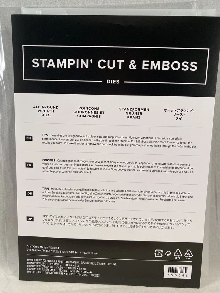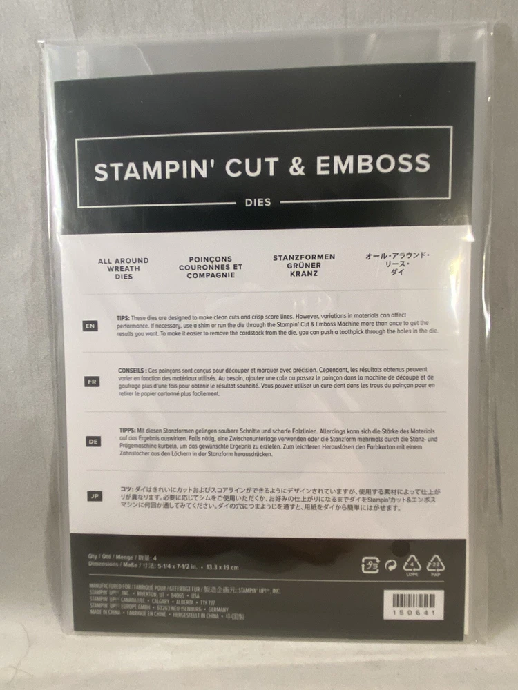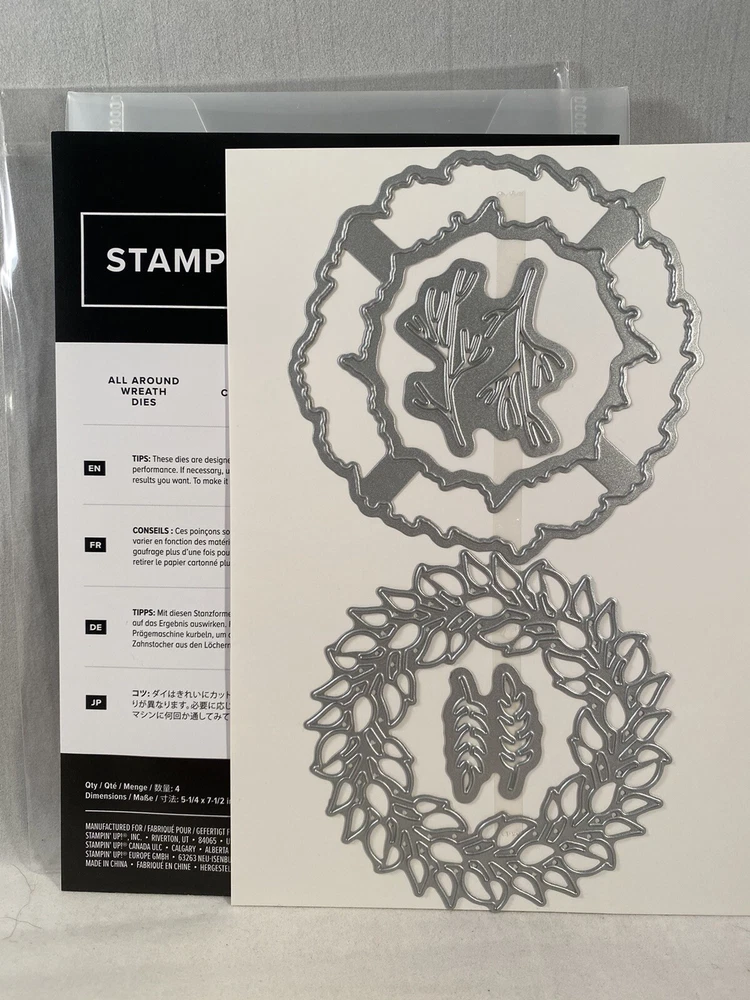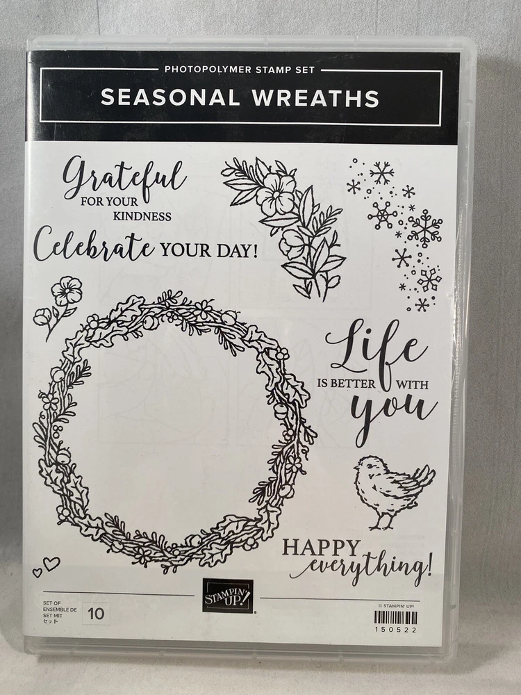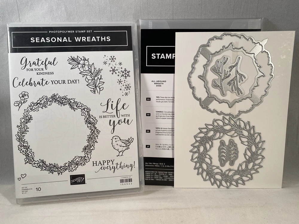 Seasonal Wreaths stamp set by Stampin Up - Retired Stamp set is new. Photopolymer mount - requires acrylic blocks which is not included. All-Around Wreaths Dies are new in package. Requires a Big Shot (or like product) to use which is not included. Shipping to United States and APO (Military PO box) address only.