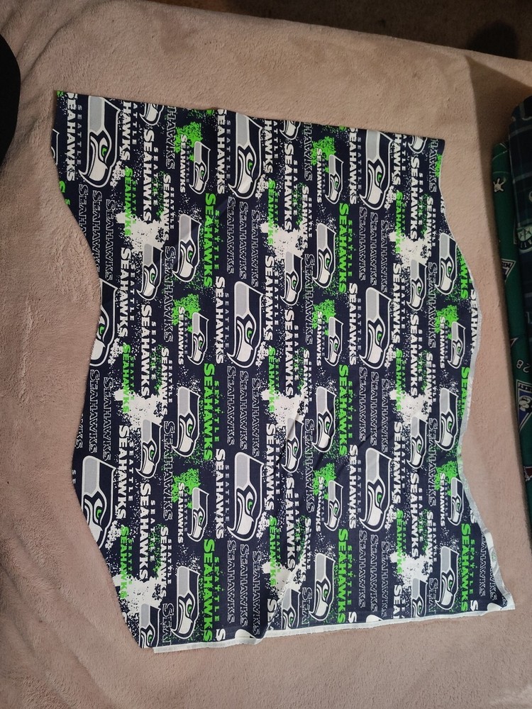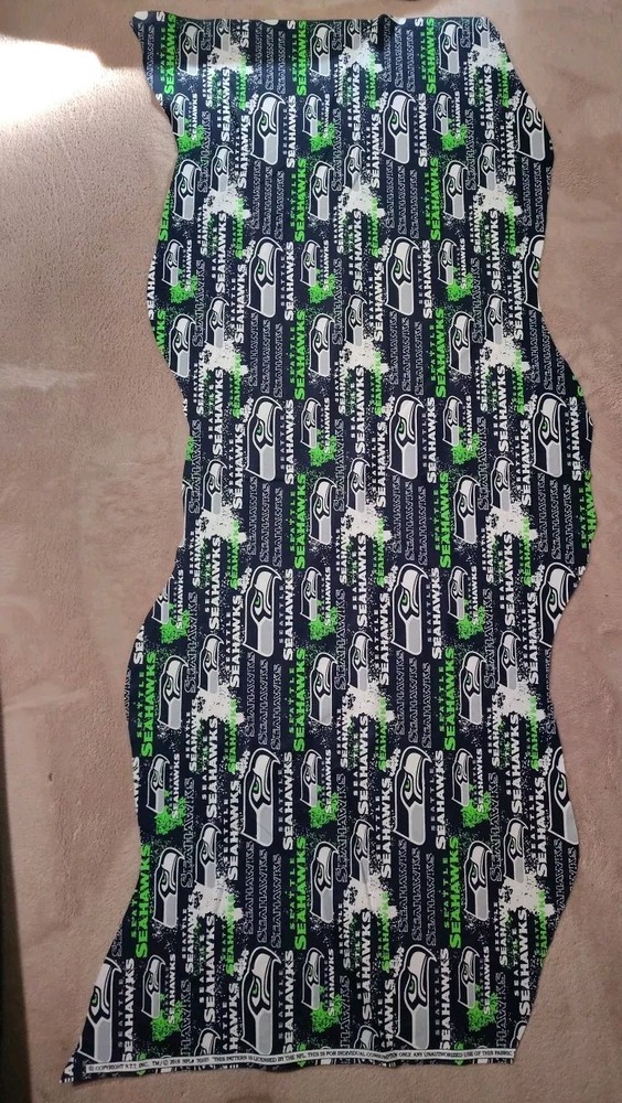 These pieces are not exactly the same size but are within a 1/2 of the measurement. This SEATTLE SEAHAWKS fabric scrap remnant piece is a must-have for any football fan or crafter. Measuring roughly 17" x 44" and made of cotton material, it features a unique green and blue color scheme and wave shape cut that perfectly represents the team's colors. This piece is perfect for creating small crafts or adding to a larger project. It is sold in remnants and is ideal for those who want to add a touch of football spirit to their creations. Get your hands on this one-of-a-kind fabric scrap remnant piece today!