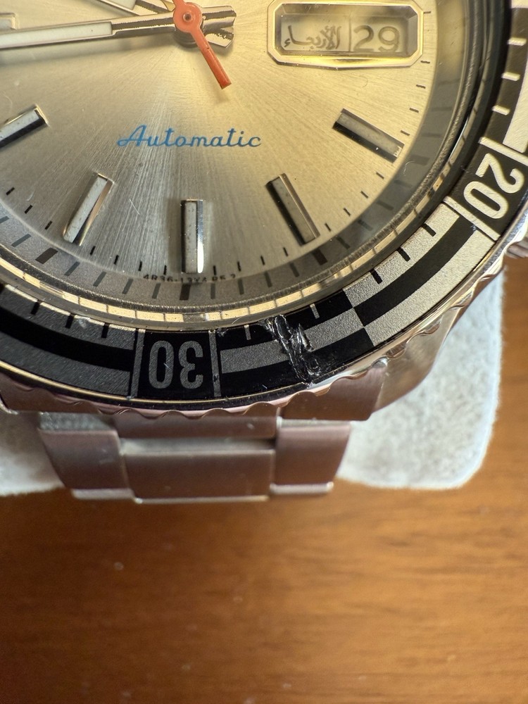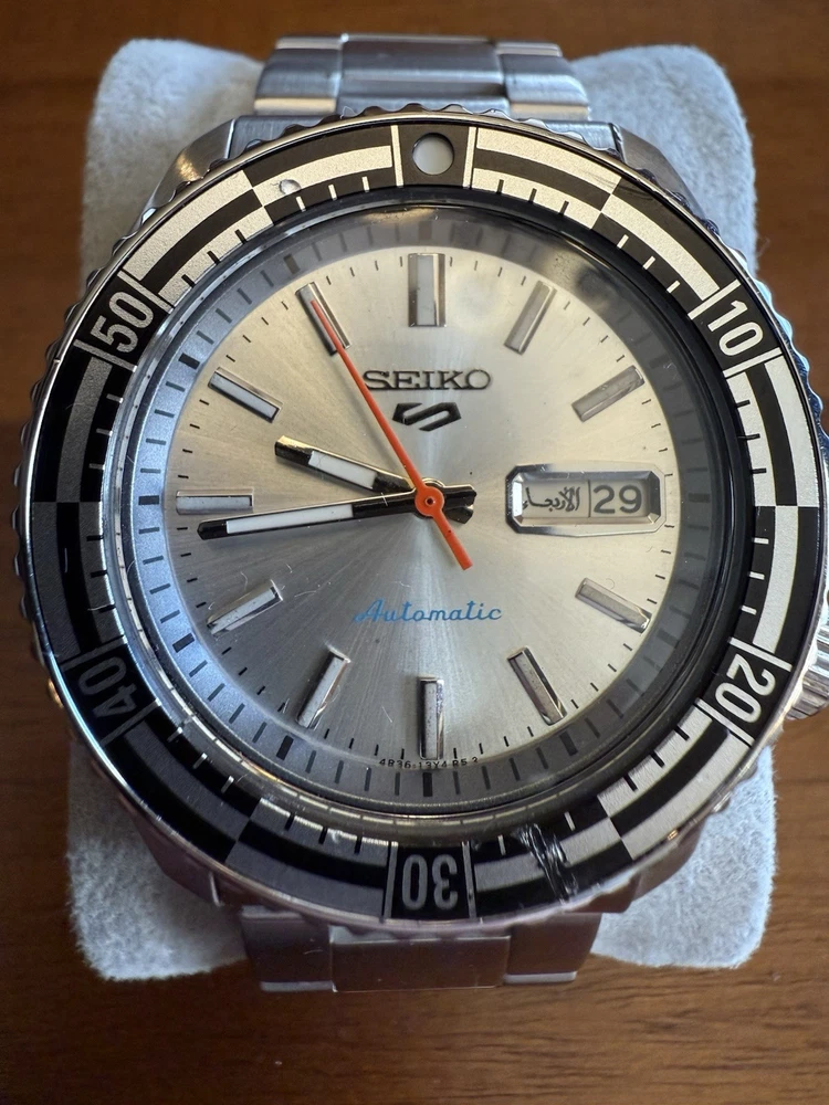 Exceedingly rare 55th anniversary sports watch, 2024 special edition with elegant Arabic lettering. PLEASE NOTE: watch has multiple scratches on the bezel, as seen in photos. Watch runs, it’s a good watch and it’s quite rare. Made in 2024