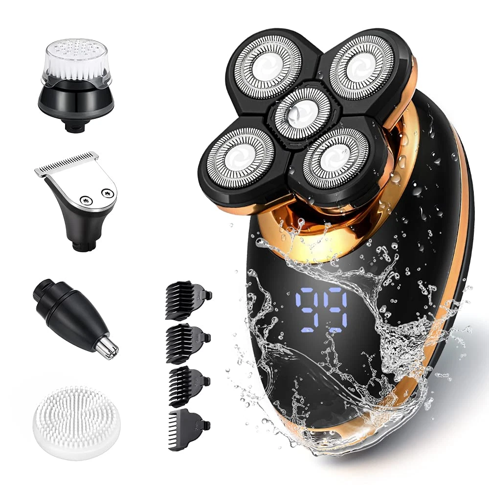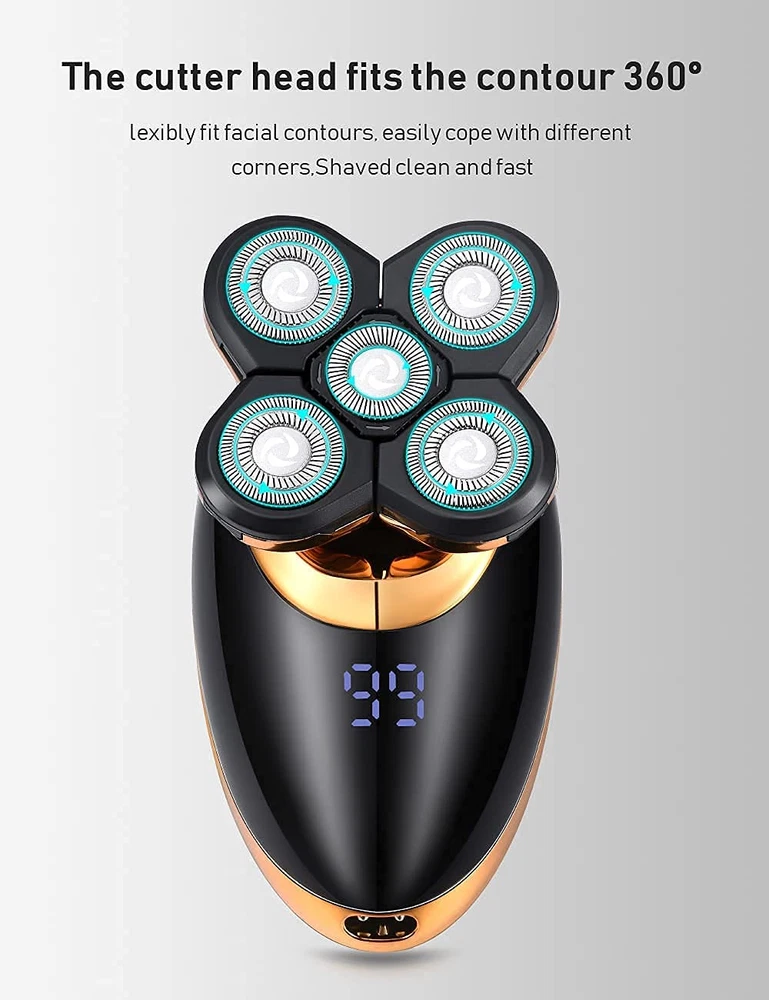 [ Multi Functional ] 5 in 1 Grooming Kit: Includes beard shaver, hair clipper with 3-6-9-12 mm guide combs, nose hair trimmer, Sideburn trimmer and facial cleansing brush, meets any body shaving. [ Fast and Comfortable ] 5D Full-Fit Three-Dimensional Cutter Head, Larger Area Flexibly Fits the Facial Contour, Easy to Deal with Different Corners, Low Battery Stability System to Prevent Jamming. Shave Clean, Fast and Comfortable. [ Faster Charging & LED Display ] USB Charging Port Can Charge for 45-60 Minutes Can be Used Wirelessly for 90 Minutes. The shaver has an LED display, you can see the remaining power, charging status. [Waterproof Safe for Wet & Dry Use] Waterproof electric razor head shaver for men enables you to shave with foam or water, even in the shower. Just open the shaver head and clean it with the supplied brush, or wash the body with water directly. [Ideal Gift ] Easy to clean, small and light, easy to carry , It is a great gift for husband or boyfriend at home or traveling on Valentine's Day and Christmas. Product Description dghvin Electric Razor Men Head Shavers for Bald Men Wet Dry Shaver The electric shaver fits hand perfectly to ensure you experience comfortable and intuitive shaving of your head and face. 5D rotary blade heads automatically adapts to the contours of your head, face, neck and even the jaw, providing you a comfortable and close shave. Increase the double ring veneer knife net design to increase the contact area by 50%, with the internal sharp blade, bring better shaving effect. 5D Dloating Head 5D Precision & sharp rotary blades shaver of the razor allow reaching more hair with every pass, resulting in smooth and close shave.An excellent solution for mens bald head shaving,ensures gentle close shave of the all areas of head and neck in few minutes.Please use the hair clipper to trim the hair to less than 5 mm, then use the shaver to get a perfect bald look. Easy to Clean Waterproof design support to be cleaned directly under the running water. You need to flip up each blades,then the hair can then be completely cleaned out. Cordless & Rechargeable Lithium battery with 45-60 minutes of charge time, you can use the trimmer for 90 minutes, cordless. It is rechargeable with laptops, cars, sockets. Easy & Fast Results The way that our shaver is structured makes it easier and faster to get the results you want. STEP 1 STEP 2 STEP 3 STEP 4