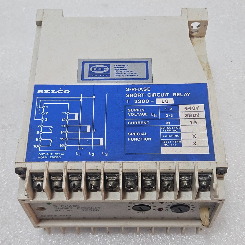 We are pleased to offer SELCO T2300-10 3-PHASE SHORT-CIRCUIT RELAY 380/440VAC 1A LATCHING PROTECTION RELAY Product Detail: SELCO T2300-10 3-PHASE SHORT-CIRCUIT RELAY 380/440VAC 1A LATCHING PROTECTION RELAY BRAND: SELCO MODEL: T2300-10 PRODUCT TYPE: 3-PHASE SHORT-CIRCUIT RELAY RATED CURRENT: 1 A SUPPLY VOLTAGE: 380 / 440 V AC SPECIAL FUNCTION: LATCHING TRIP Shipment processing time: All orders are processed within 1-2 business days. Orders are not shipped or delivered on weekends or holidays. Shipment confirmation & Order tracking: You will receive a Shipment Confirmation email once your order has shipped containing your tracking number(s). The tracking number will be active within 24 hours. Customs, Duties and Taxes: We are not responsible for any customs and taxes applied to your order. All fees imposed during or after shipping are the responsibility of the customer (tariffs, taxes, etc.). Damages: In case of damage or lost of shipment during transit, We will investigate the matter and provide the satisfactory resolution. Returns Policy: We offer return or exchange of ordered item up to 30 days of receipt of goods in subject to certain condition. In case of damaged goods we shall offer the replacement or refund for the ordered item. If you require any more details, request you to send us the direct message through eBay for early resolution. Thanks