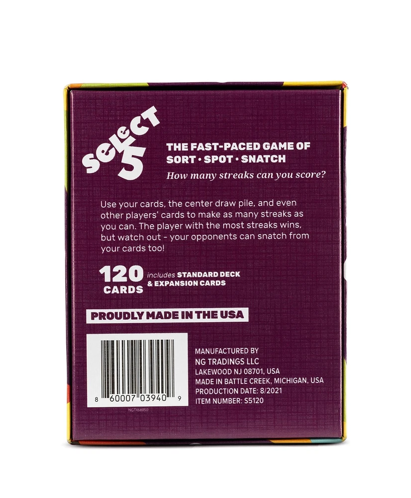 SELECT 5 Card Game - The Lightning Fast Game for Kids, Families, and Adults - Perfect for Family Game Night / 2-4 Players FAST PACED: It’s a race to get the most streaks! Quickly flip cards and select your sequences - but watch out for other players who try to snatch your cards away! PERFECT FAMILY GAME FOR GAME NIGHT: Appropriate for ages 8 to adult, this easy to learn game takes just 10 minutes per round and will get everyone on their toes! FUN AND EDUCATIONAL: Select 5 is a fast-paced game that increases focus and hand-eye coordination. MAKE IT A GIFT: Select 5 is the perfect travel-friendly gift for kids, families and couples! FULL SET INCLUDED: Each game includes one Select 5 deck, one expansion deck, and easy to follow instructions. MADE IN USA: Select 5 is 'Made in USA' - giving you the quality you want and deserve. Shipping We offer FREE shipping on all orders! We use a selection of shipping services such as UPS, FedEx, USPS etc. We only ship to the lower 48 states, no APO/FPO addresses or PO Boxes allowed. Local pickups and combined shipping options are not provided at this time. Return You can return a product for up to 30 days from the date you purchased it. Any product you return must be in the same condition you received it and in the original packaging. Please keep the receipt. Payment We accept payment by any of the following methods: PayPal Please pay as soon as possible after winning an auction, as that will allow us to post your item to you sooner! Feedback Customer satisfaction is very important to us. If you have any problem with your order, please contact us and we will do our best to make you satisfied. Contact Us If you have any queries, please contact us via ebay. We usually respond within 24 hours on weekdays. Please visit our eBay store to check out other items for sale! Thank you for shopping at our store.